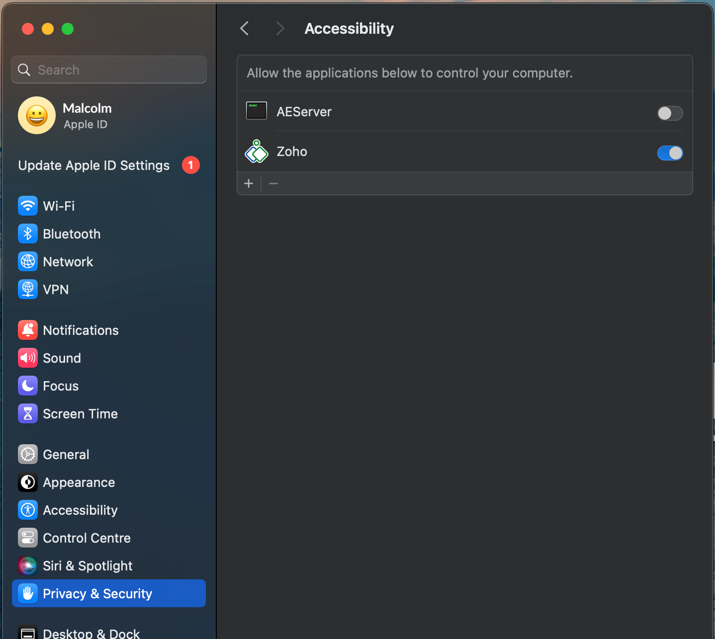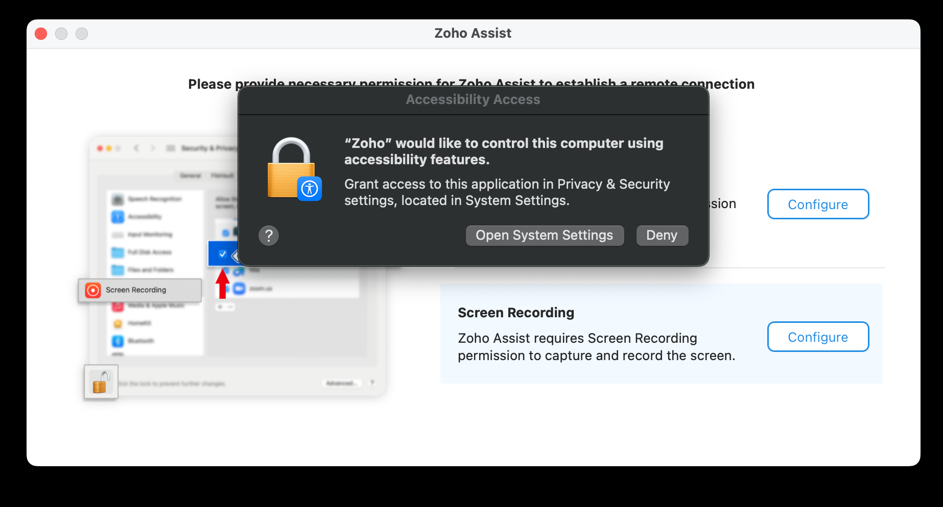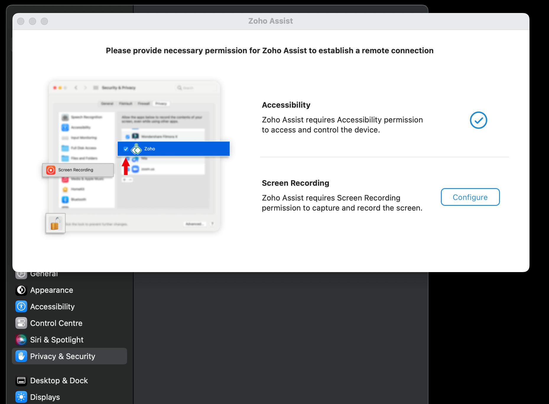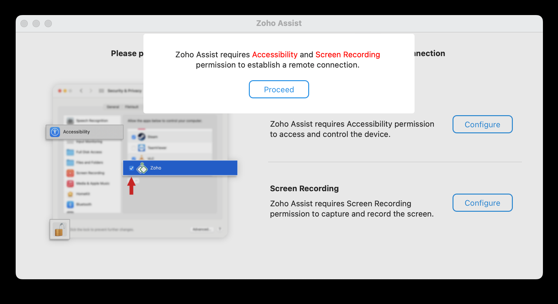 MacでのZoho Assistアクセスには以下の許可が必要になります。