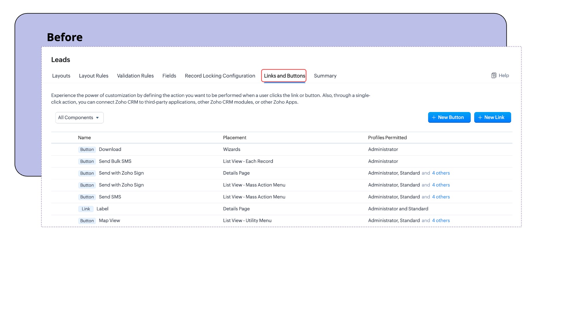 Zoho CRMのカスタムボタンは、シンプルかつ多機能なカスタマイズのツールです。ユーザーに対しよりよい操作性を提供し、必要に応じて重要な操作を実行することができます。元々はタブ内で使用するように設計されていました。