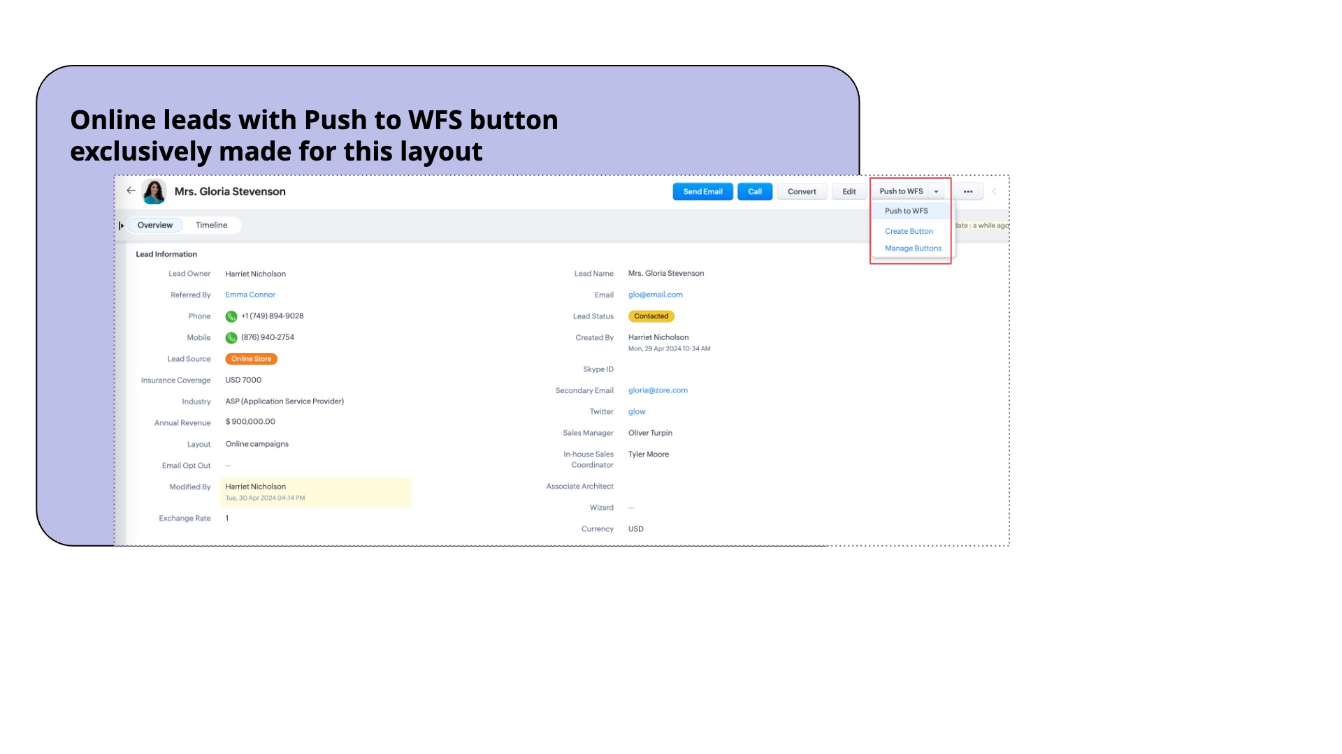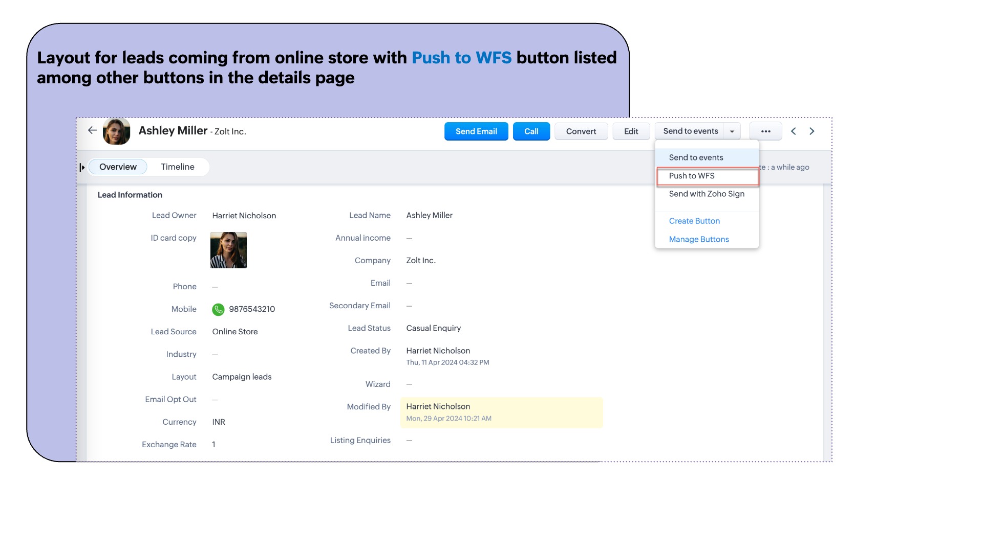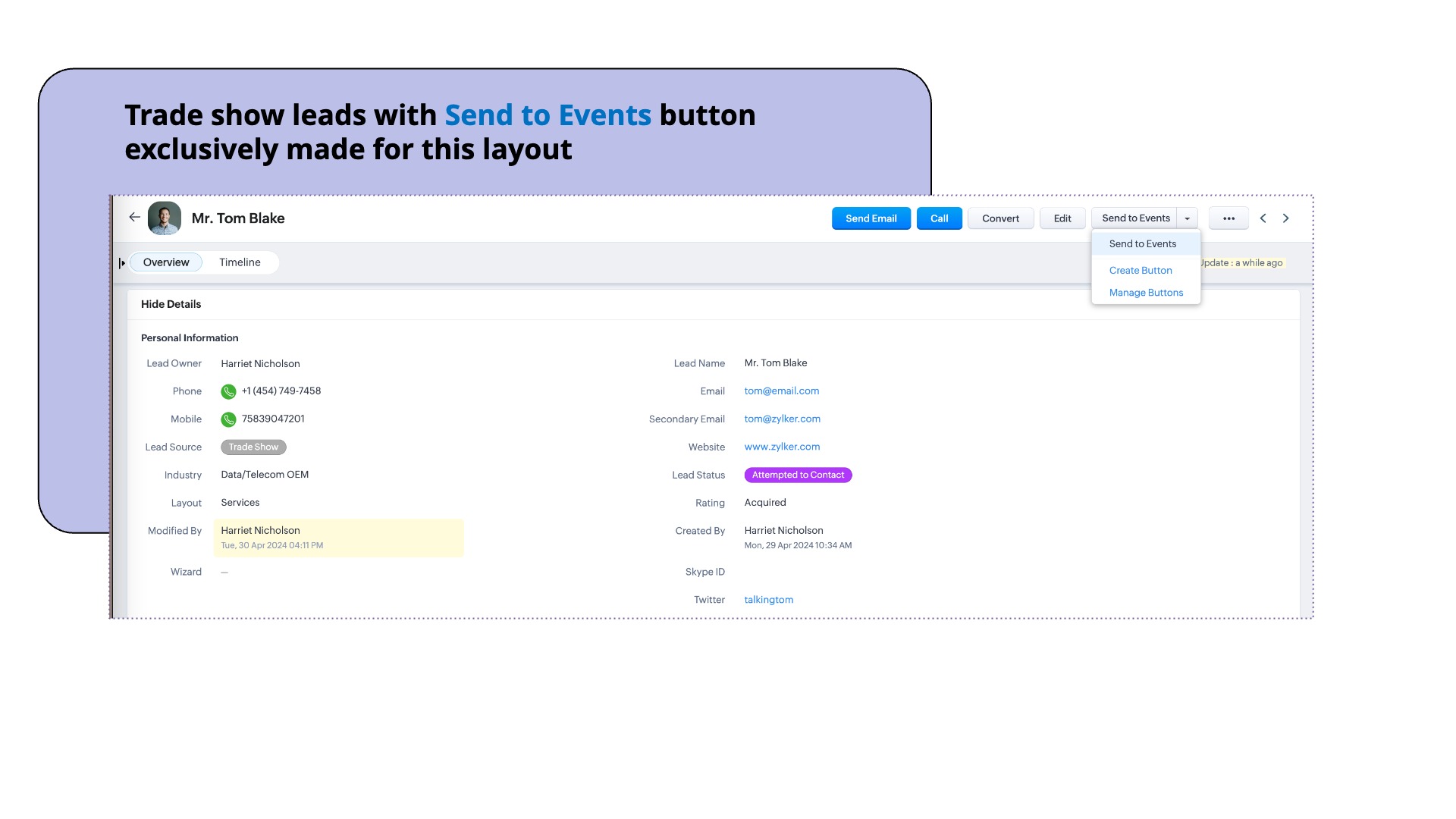 以下のスクリーンショットでは、データの詳細ページに2つのボタンが設置されています。1つは展示会からの見込み客データをイベントへ送信するボタンで、もう1つはオンラインストア経由の見込み客データを他のアプリへ送信するボタンです。どちらのボタンも、異なるアプリケーションにデータをプッシュするのに役立ちます。