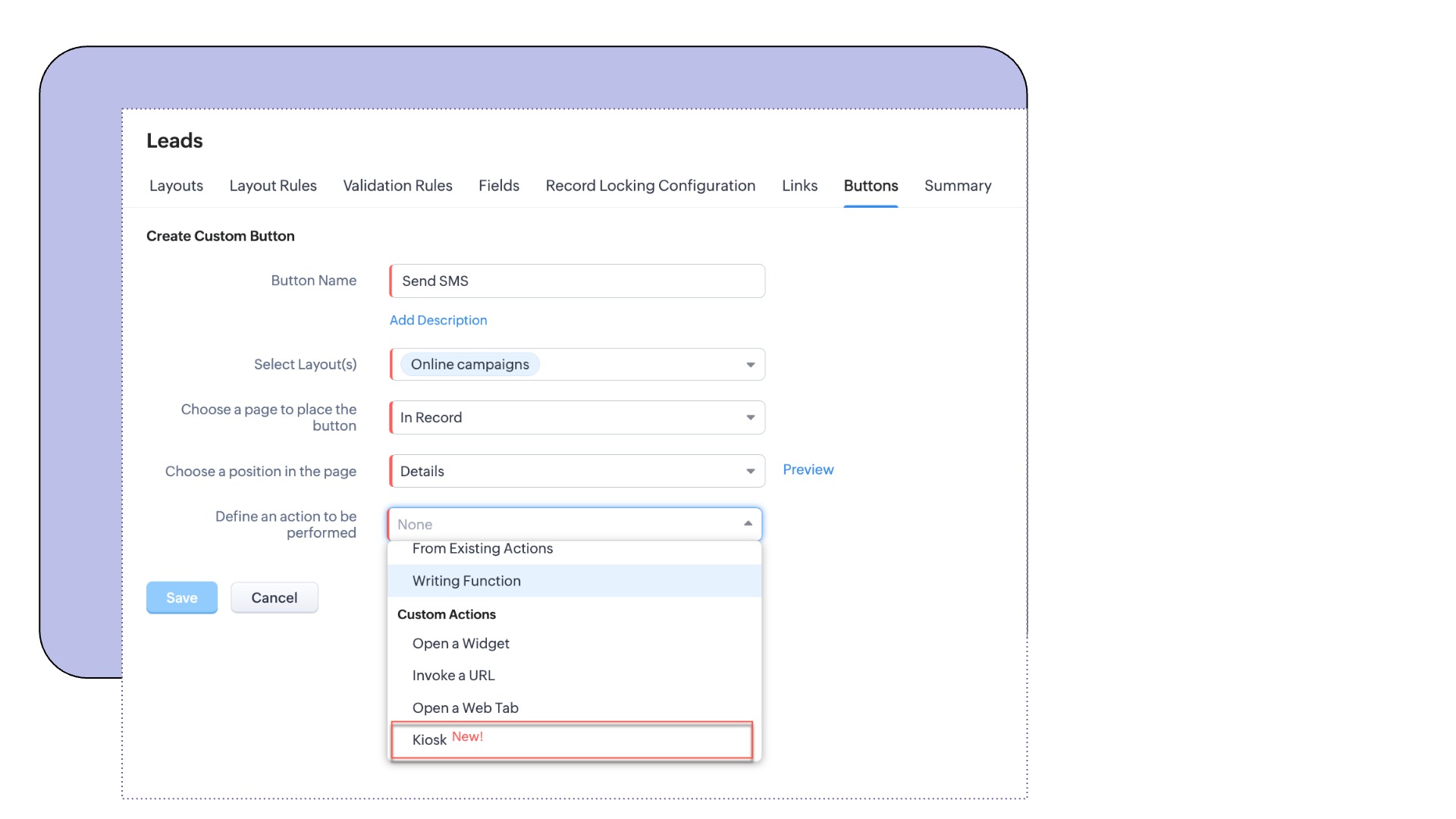 キオスク機能は、最新リリースされた機能の一つで、CRMユーザーがボタンをクリックするだけで特定の操作や処理を行うことができる、コード不要のカスタマイズツールです。素早く画面を表示したり、データベースから情報を取得したり、情報を保存したりすることができます。