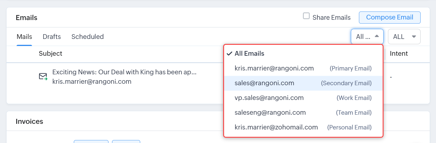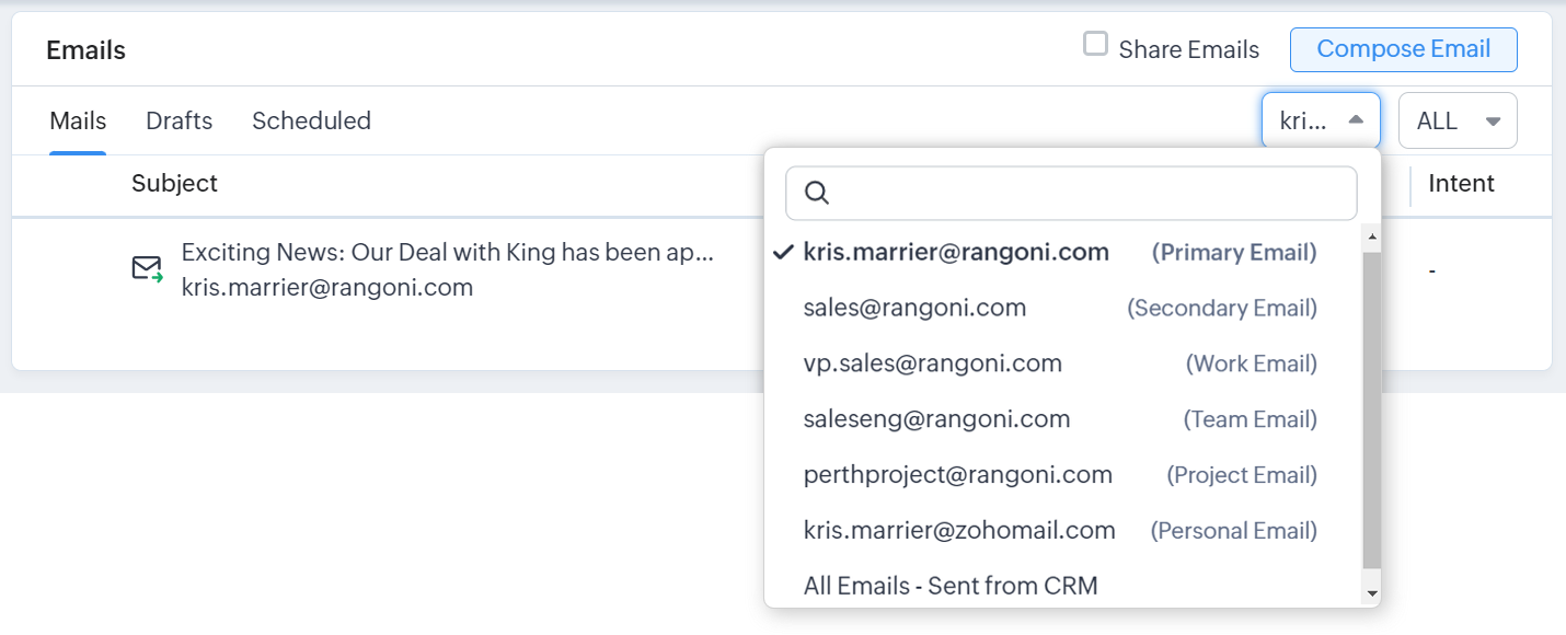 連絡先とのすべてのやりとりの全体像を把握したい場合は、「すべてのメール」ビューを選択できます。これにより、メール項目、サブのメールアドレス項目、およびカスタムのメール項目に記載されたメールアドレスに関連するすべてのメールのやりとりが表示されます。