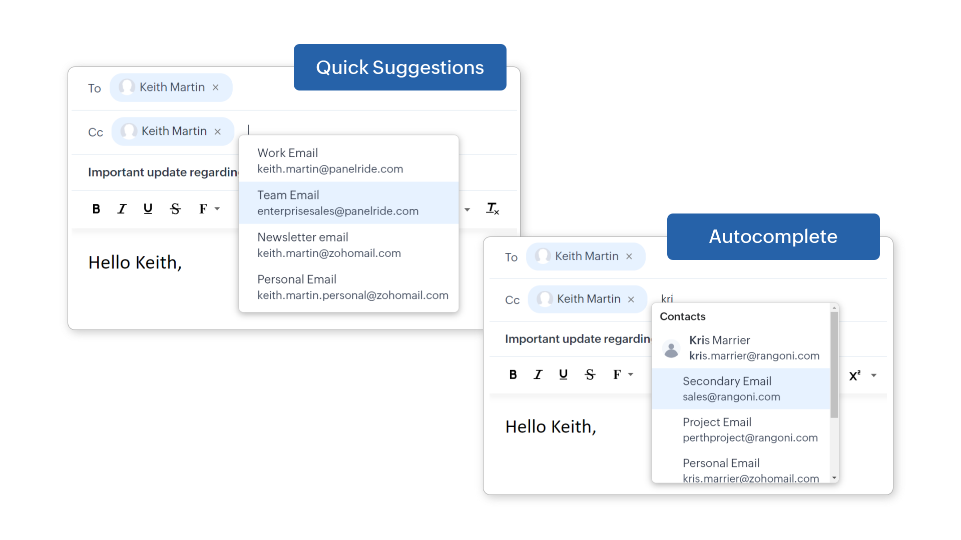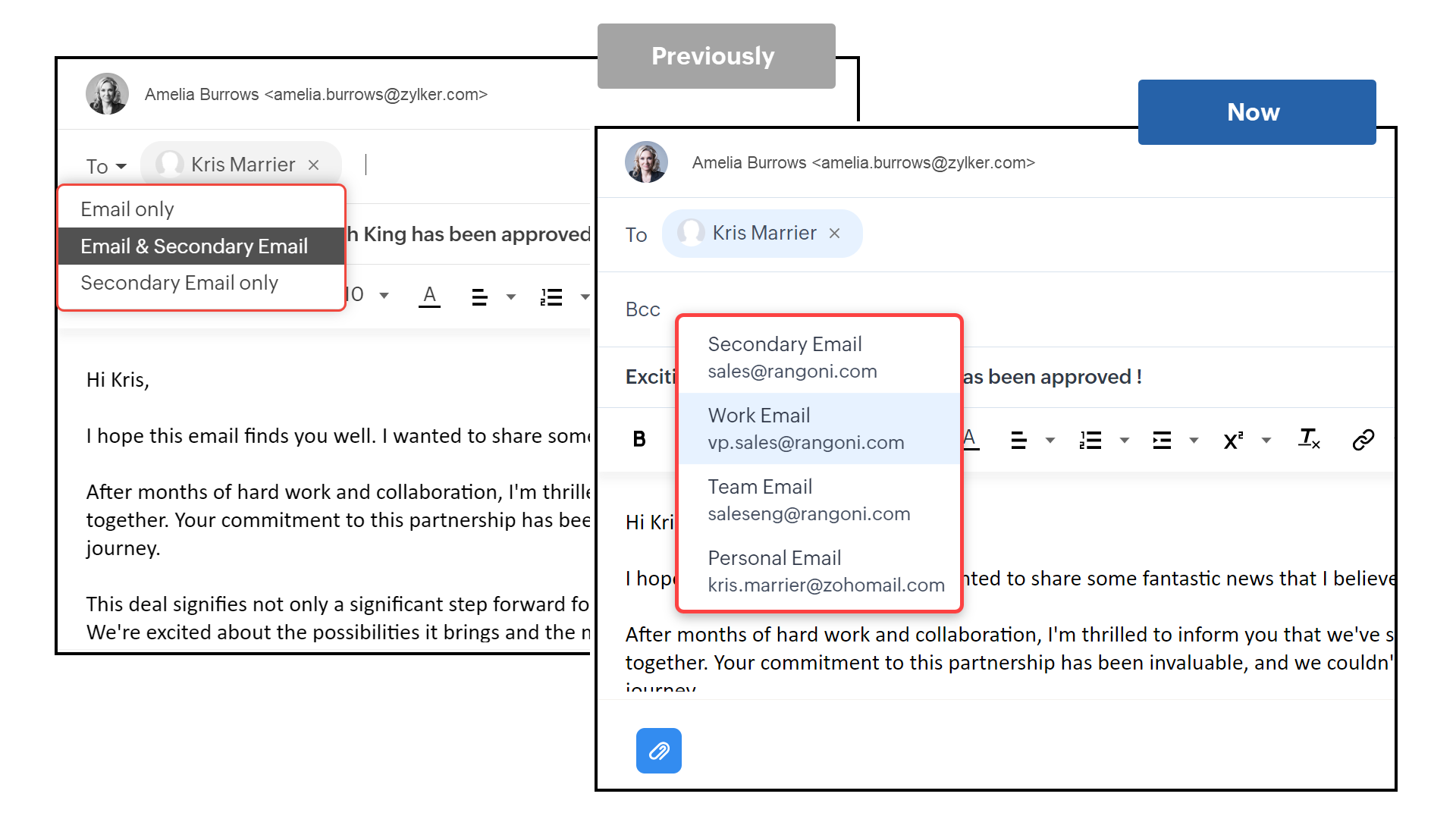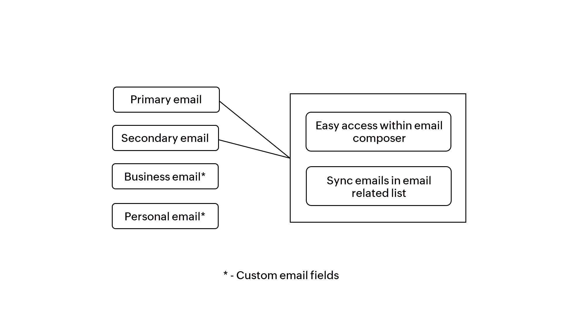 - メール作成時に、(標準の「メール」項目に記載された)メールアドレスおよび(標準の「サブのメールアドレス」項目に記載された)サブのメールアドレスに簡単にアクセスできました。カスタムのメール項目に記載されている追加のメールアドレスは使用できず、手動で入力する必要がありました。