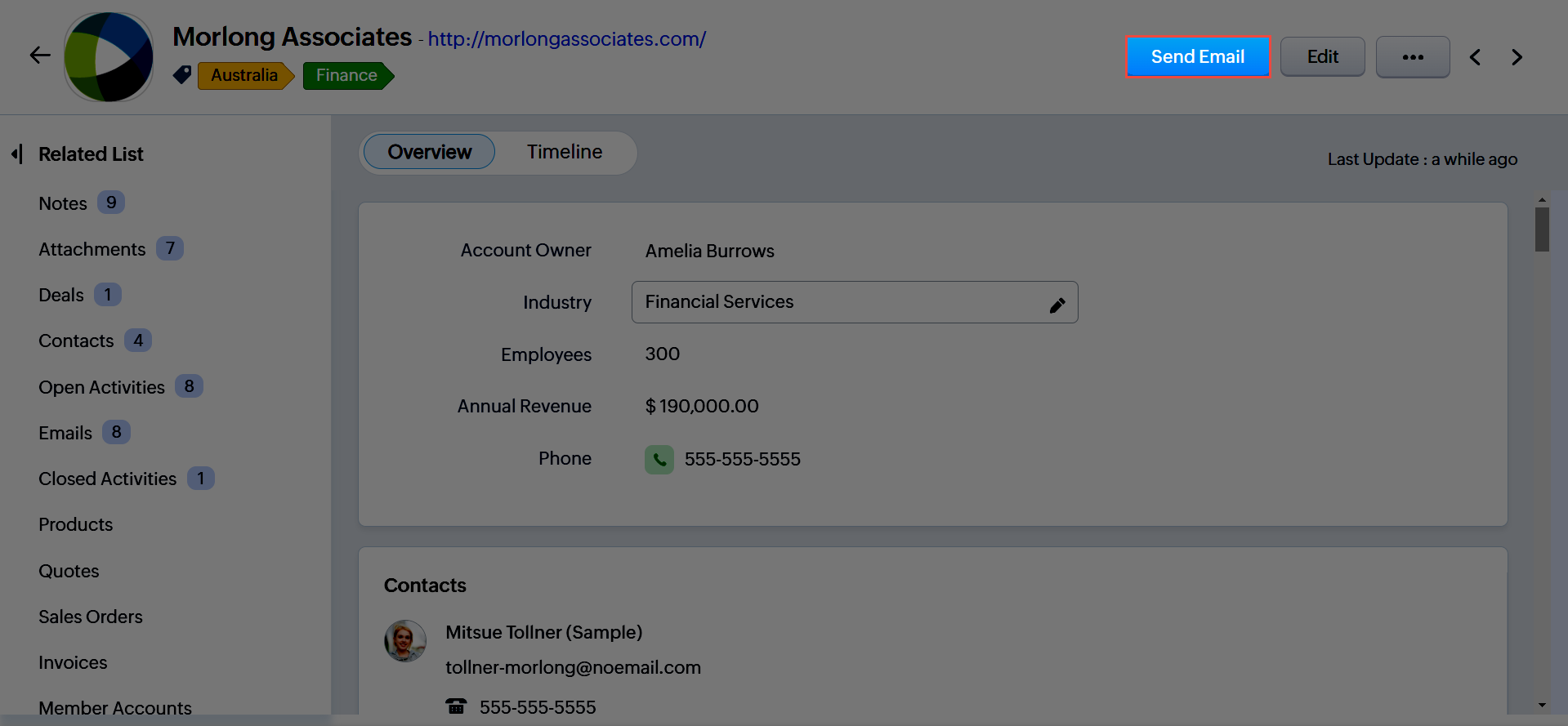 ビジネスを成功させるには、絶え間ないコミュニケーションが必要です。Zoho CRMでは、連絡先、見込み客、仕入先、その他の関係者のデータがさまざまなタブに保存されています。これらのタブやデータには、多くのメール機能が用意されています。これらの機能により、ユーザーはZoho CRMの画面内で便利にメールを送受信することができ、メールに関連する内容にすぐにアクセスすることができます。