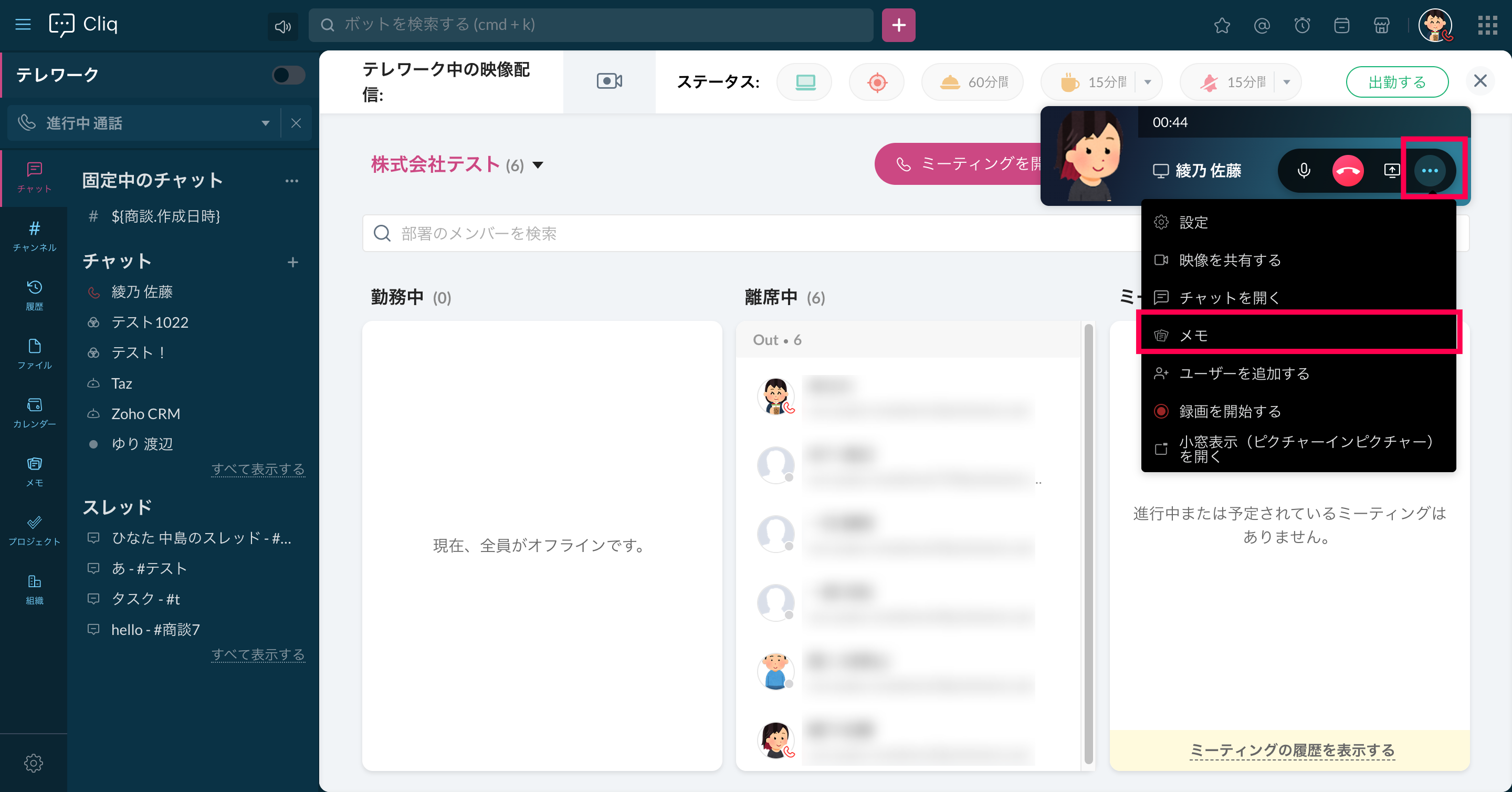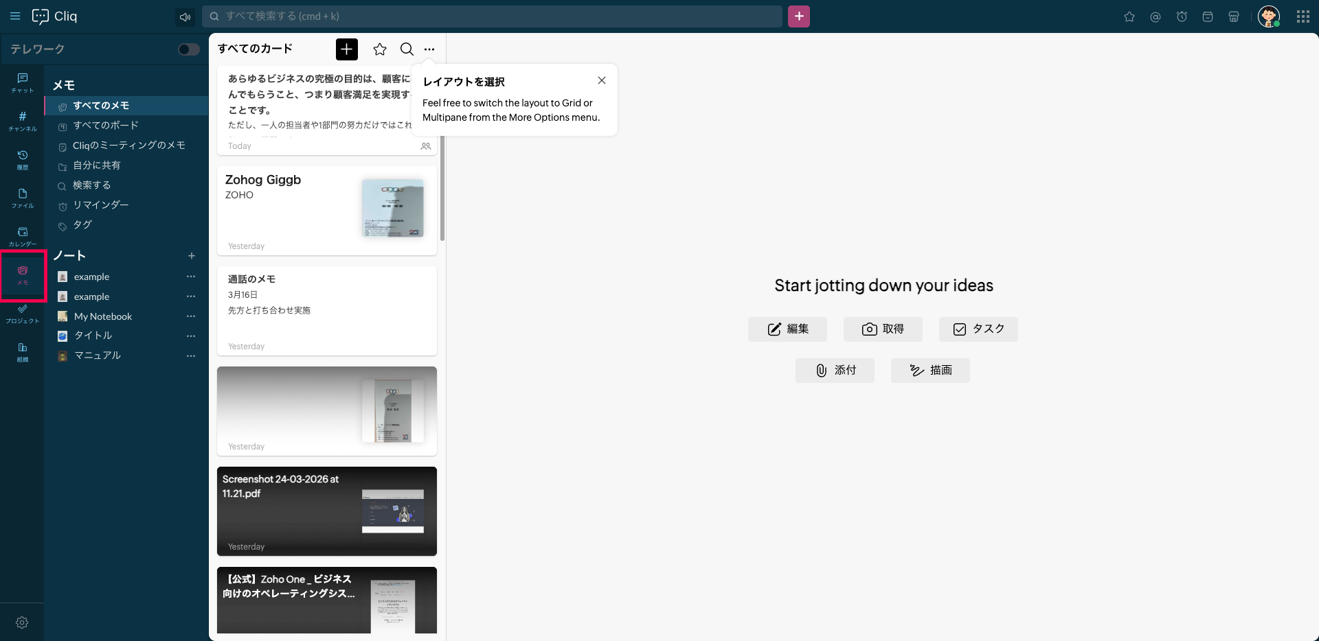 Zoho Cliqの[メモ]タブから、簡単にNotebookにアクセスできます。