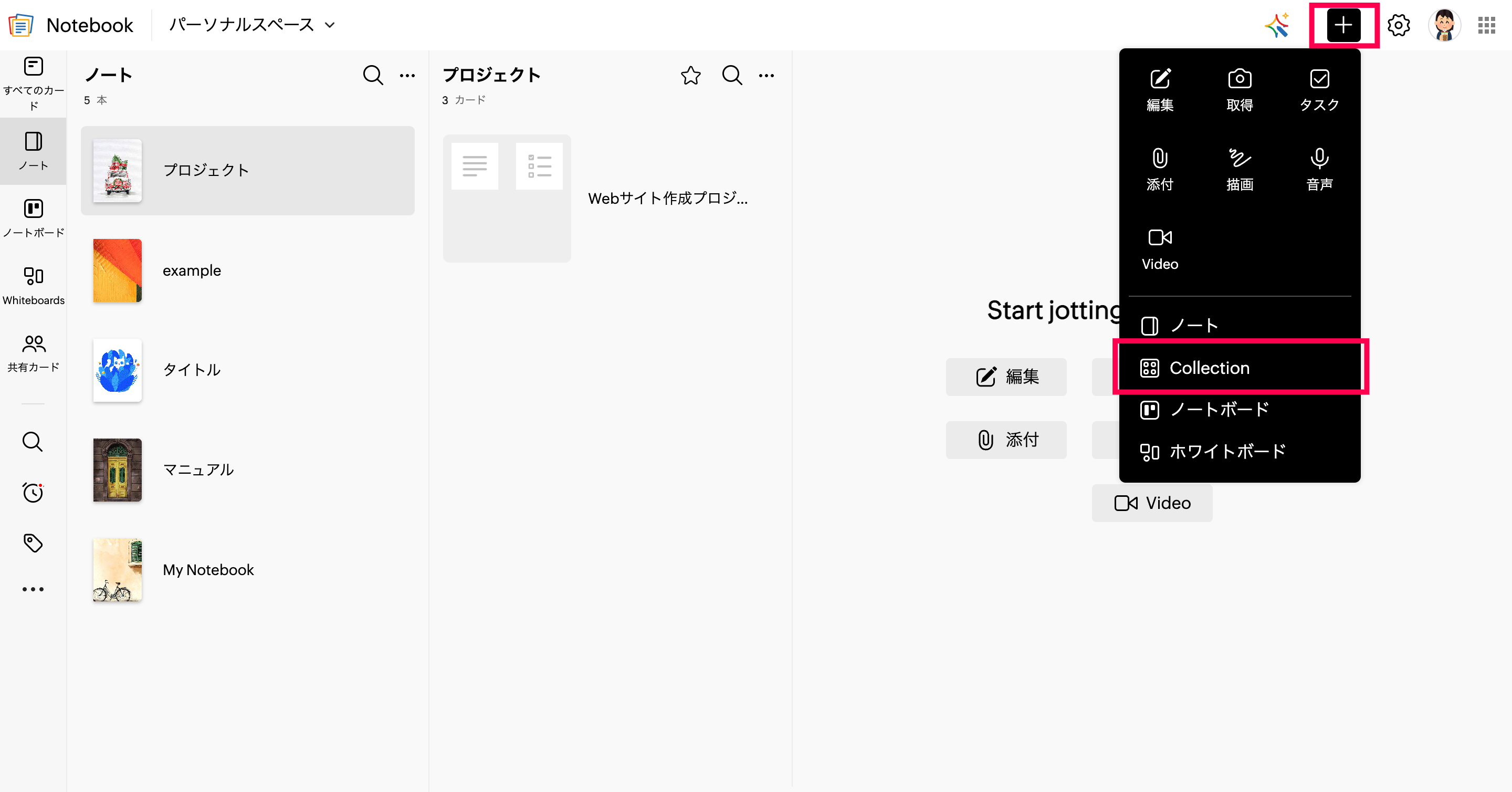 - Collectionを作成したいノートを開きます。