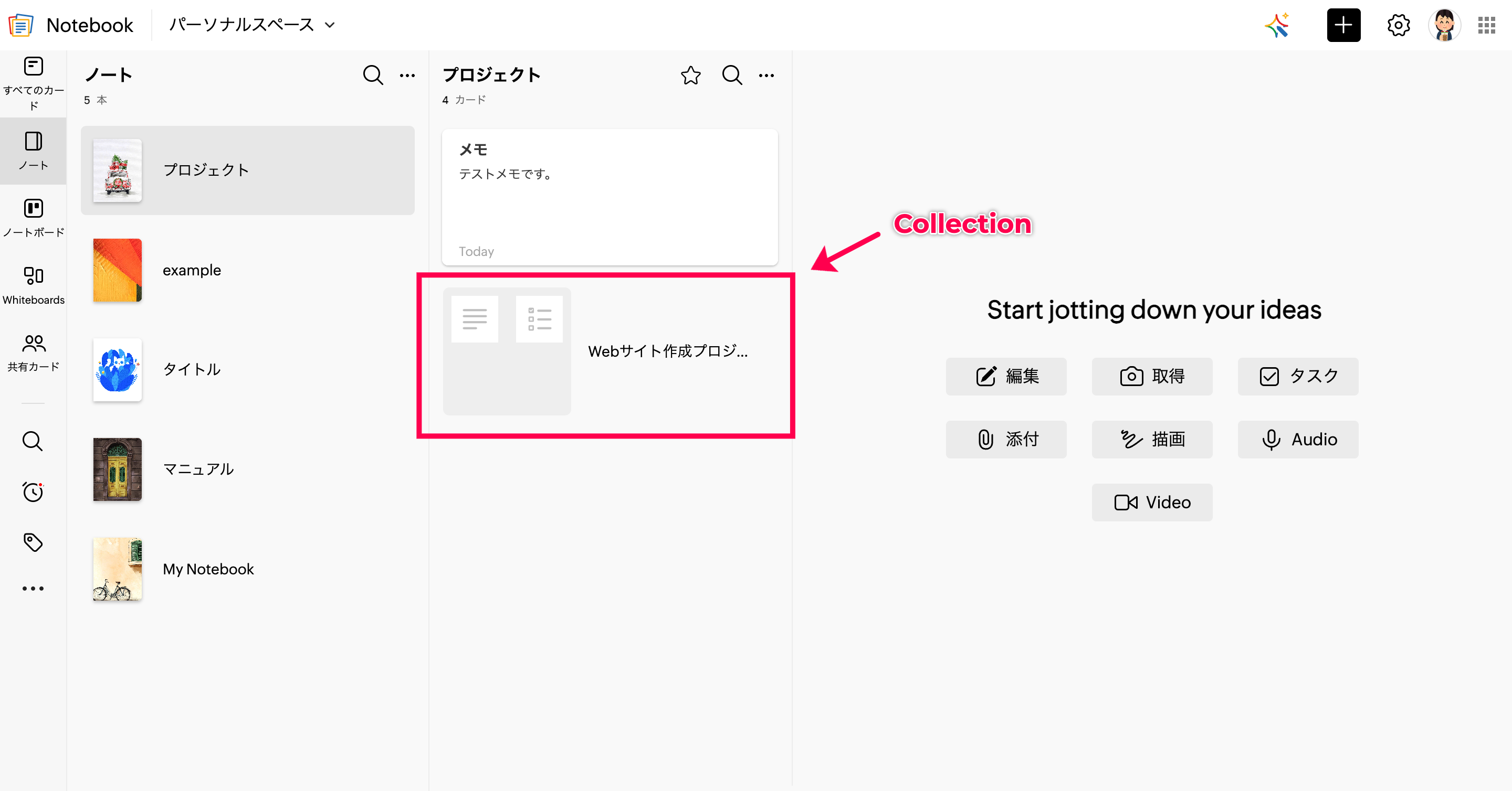 ノート>Collection>カード という構造を作成することができます。