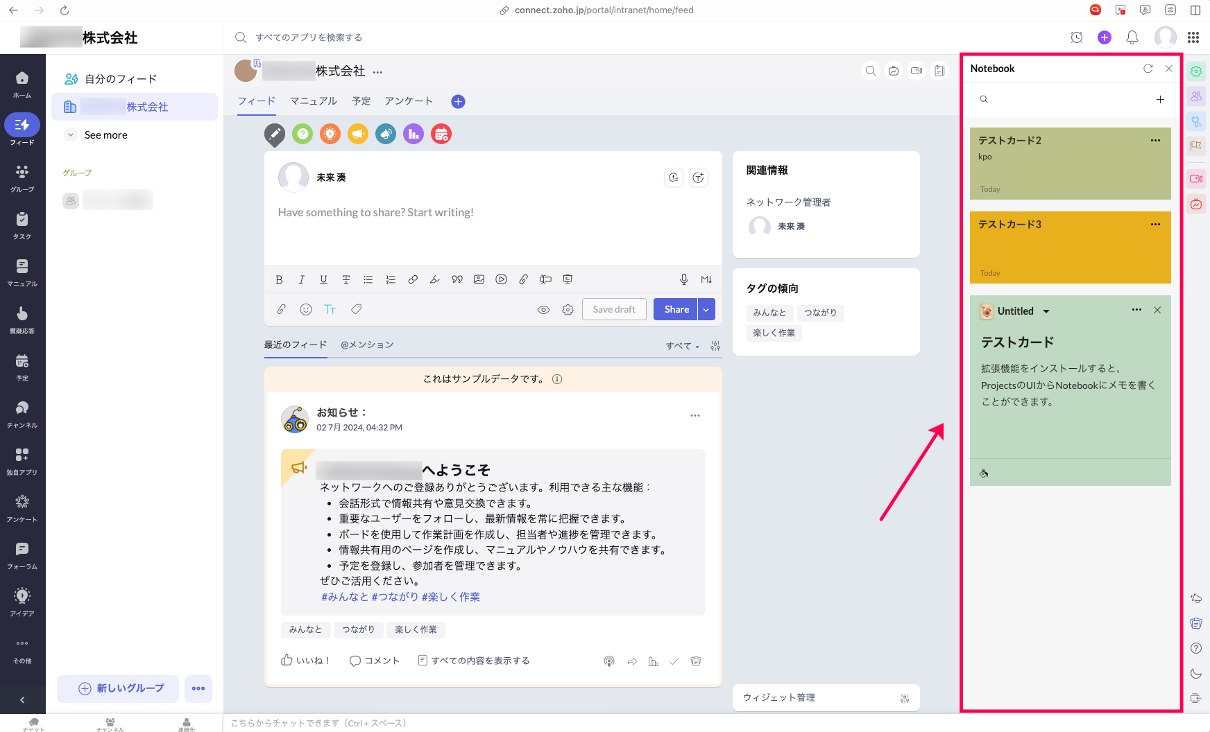 Zoho Connectに拡張機能をインストールすることで、Zoho ConnectのUI上でNotebookにメモをすることが可能です。