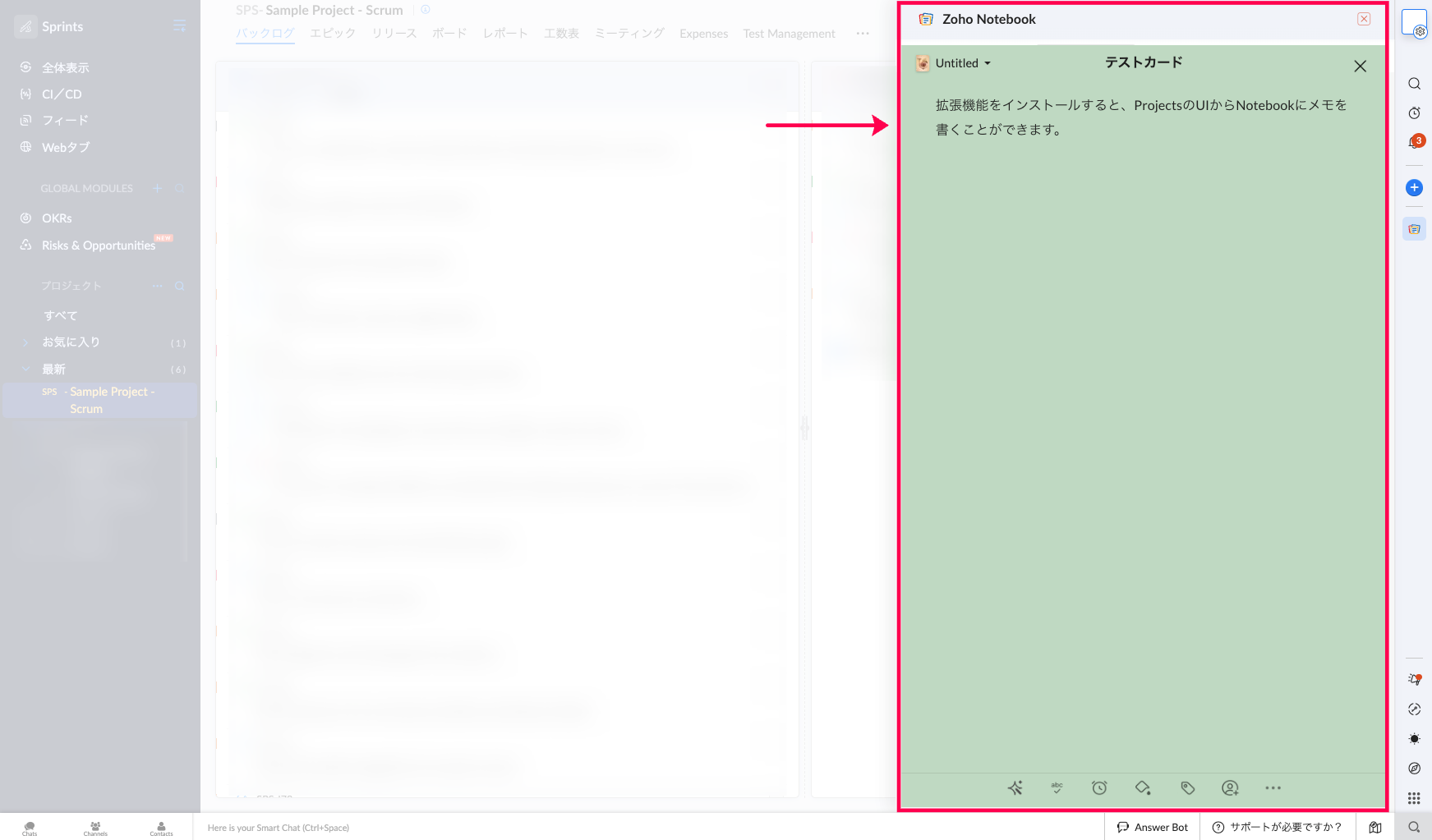 Zoho Sprintsに拡張機能をインストールすることで、Zoho SprintsのUI上でNotebookにメモをすることが可能です。