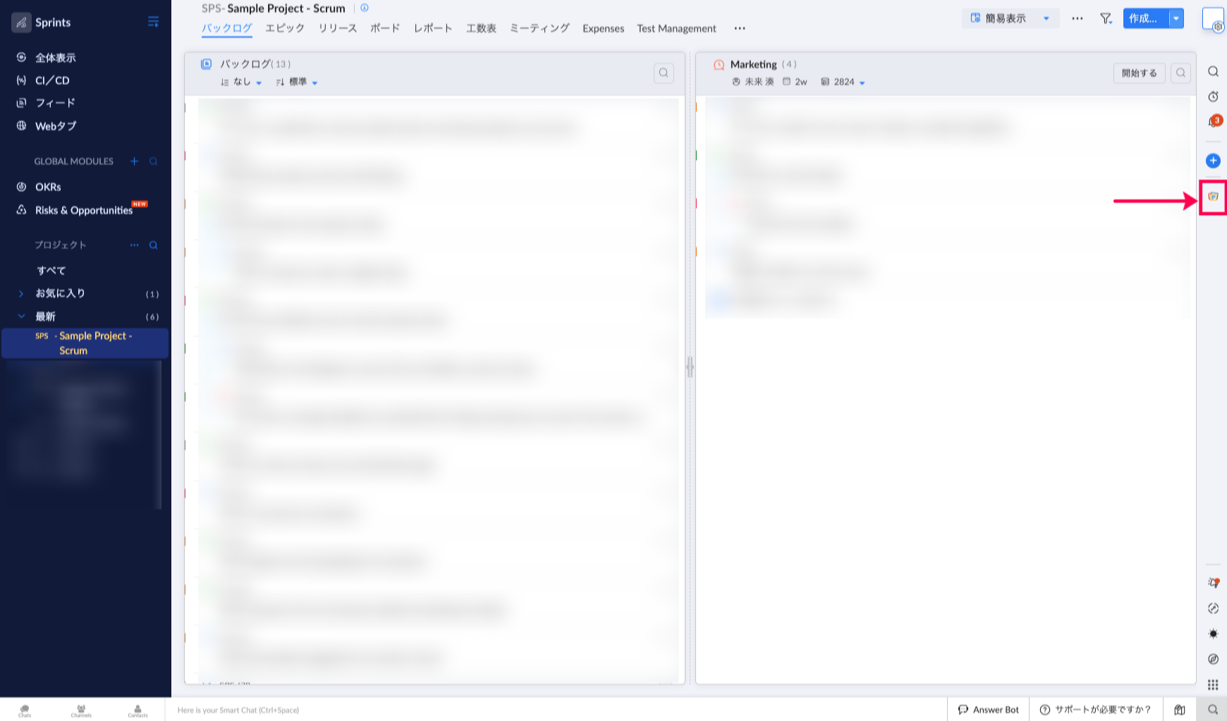 1. Sprintsに拡張機能をインストール後、画面右側のNotebookアイコンをクリックしてください。