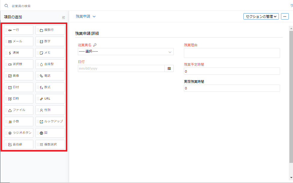 ⑤追加したい項目をドラッグ&ドロップして申請フォームを作成してください