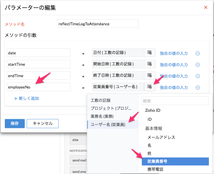 「ユーザー名(従業員)」を選択し、「従業員番号」を選択してください。