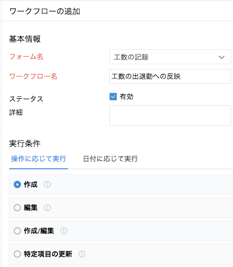 フォーム名に「工数の記録」を選択し、ワークフロー名を入力してください。
