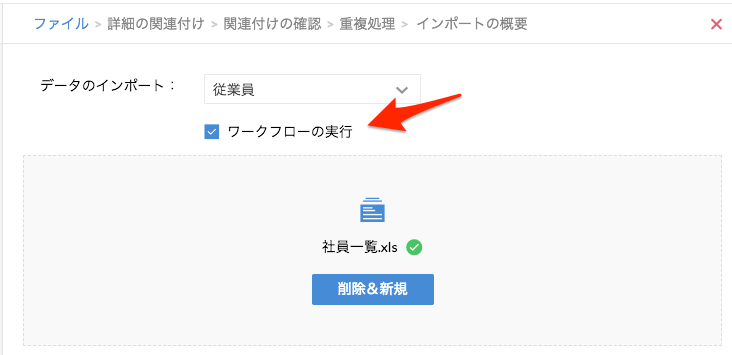 インポートの際に、「ワークフローの実行」という欄にチェックを入れると、インポート時にワークフローが実行されます。