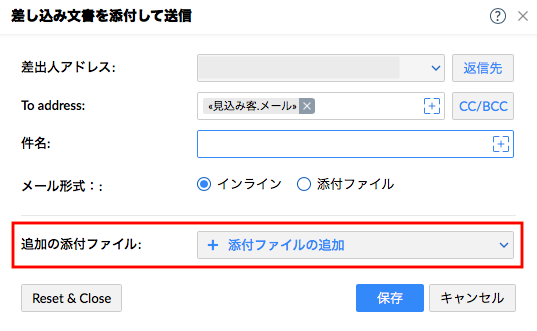 1)「差し込み文書を添付して送信」のポップアップにて、追加の添付ファイルの項目が表示されます