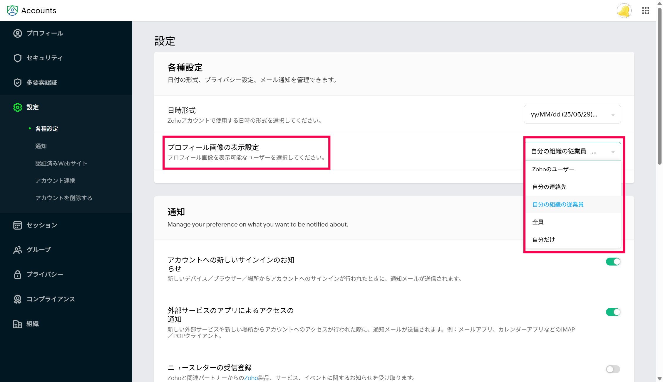 Zoho Accountsの設定画面から、プロフィール写真の公開範囲を設定可能でございます。
