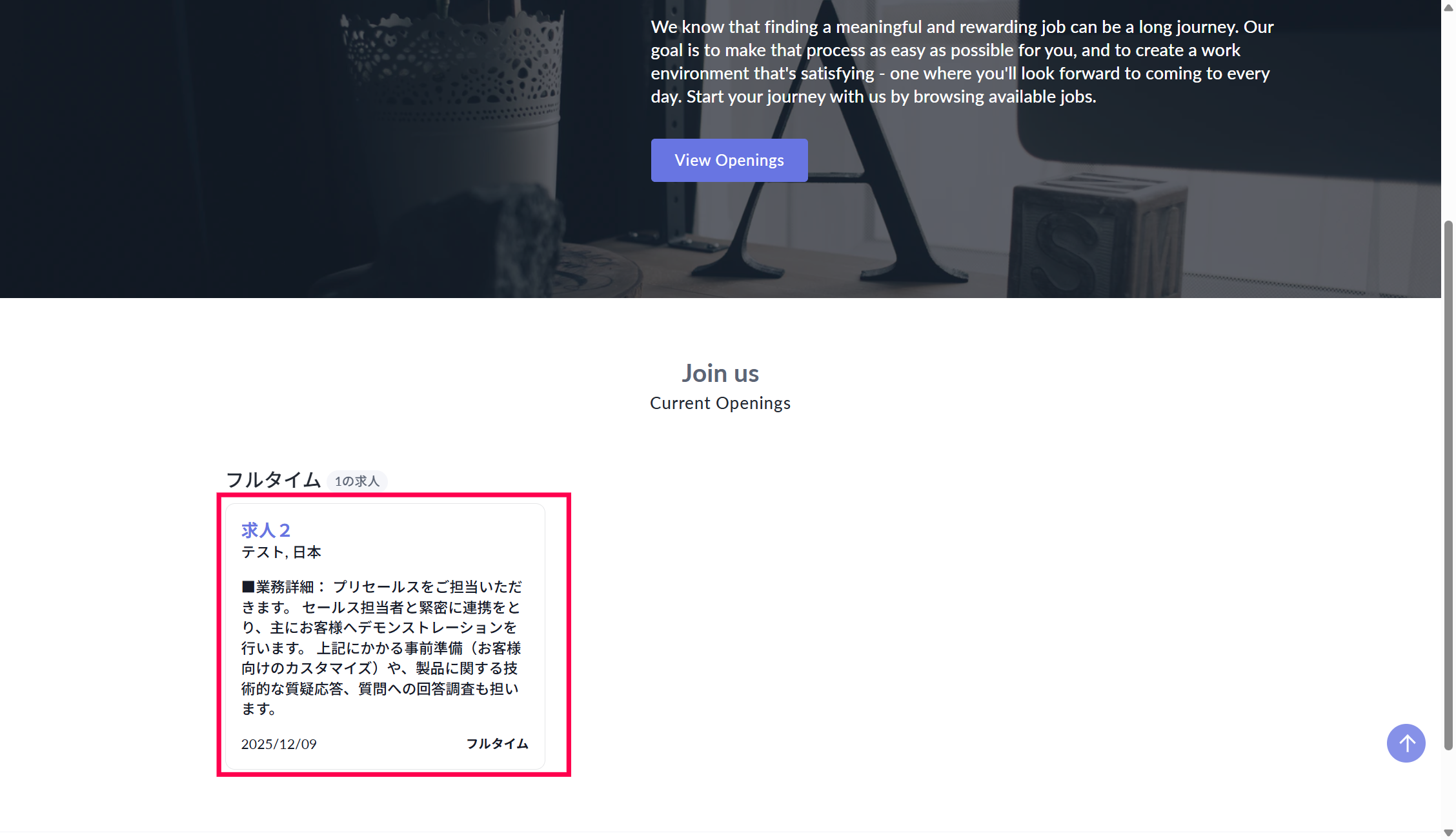 上記設定が完了すると、以下のように求人情報が採用情報サイトに公開されます。