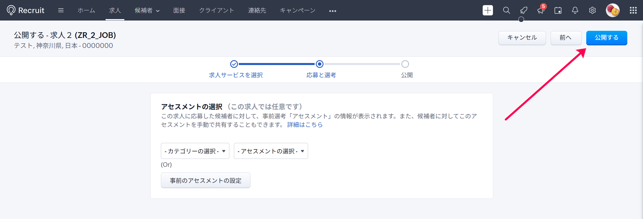 ・画面右上にある「公開」アイコンをクリックし、「採用情報サイトに公開する」をクリックします。