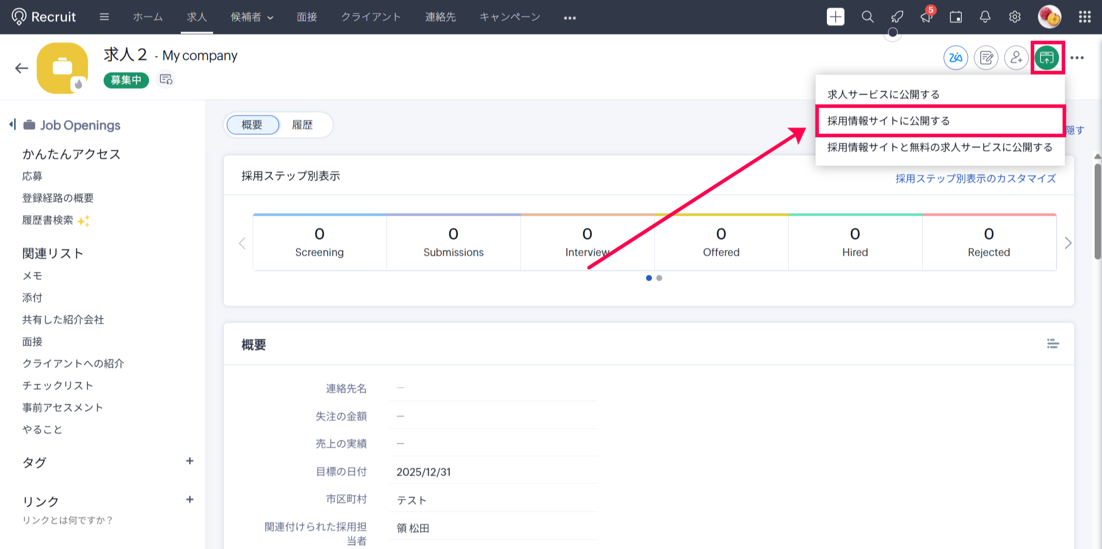 ・「募集中」となっている該当の求人データの詳細画面を開きます