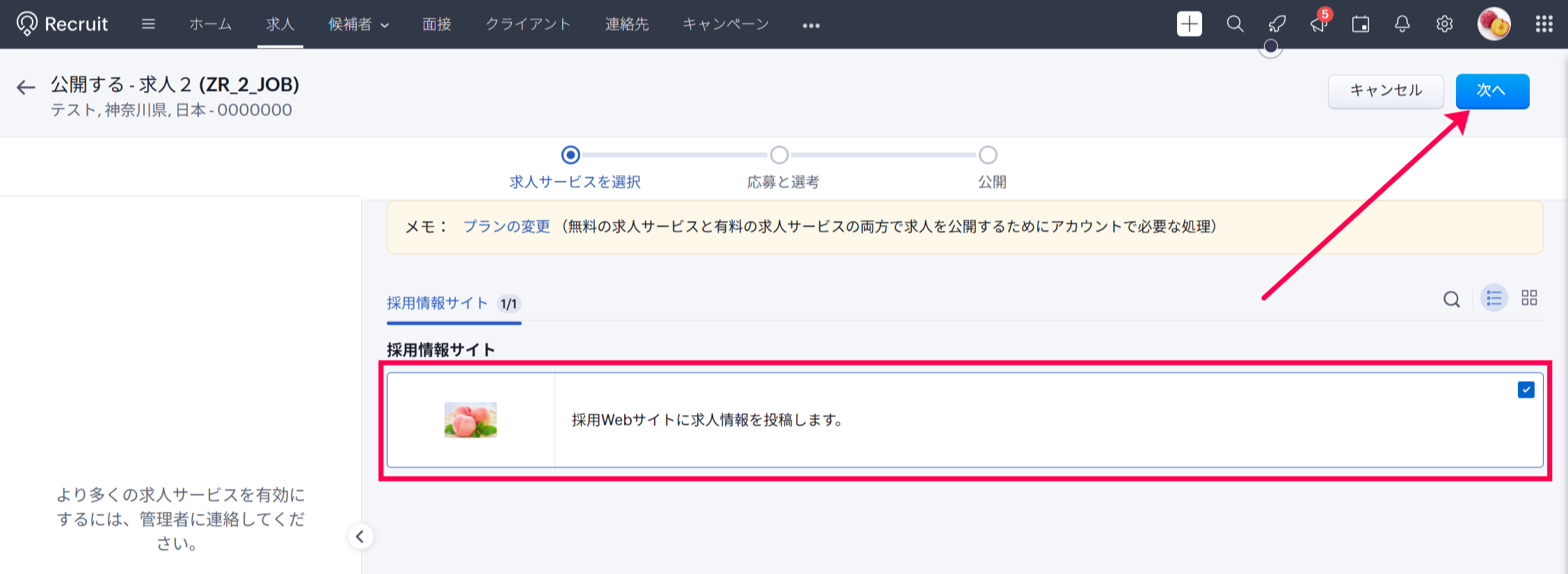 ・「求人サービスを選択」画面で、公開する採用情報サイトを選択し、「次へ」ボタンをクリックします