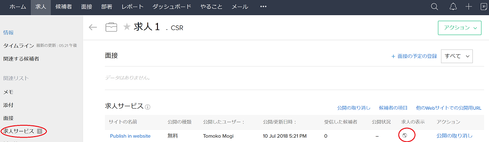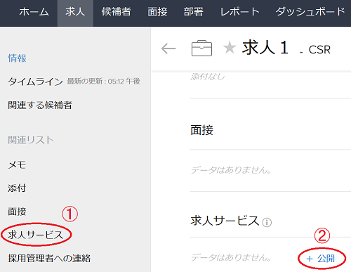 ・左フレームの「求人サービス」をクリックすると該当セクションが右フレームに表示されますので、「+公開」をクリックしてください