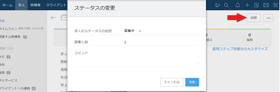 「再開」をクリックし、ステータスを「募集中」に更新してから求人情報を公開してください。