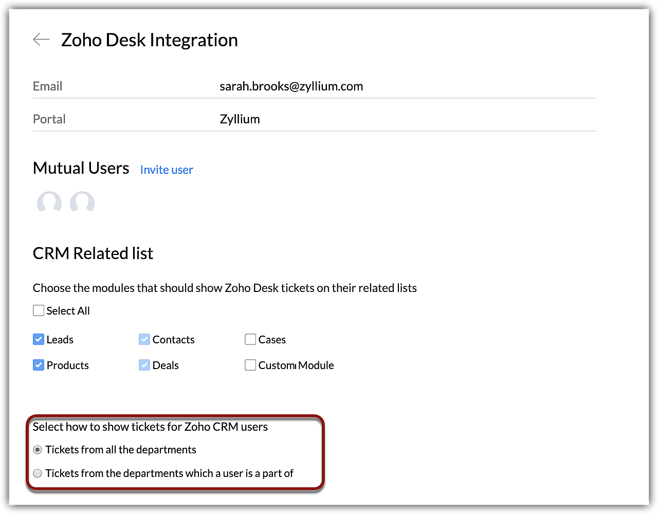 - すべての部門の問い合わせ - Zoho Desk内すべての部門で作成された問い合わせがCRMユーザーに表示されます。デフォルトでこのオプションが選択されています。