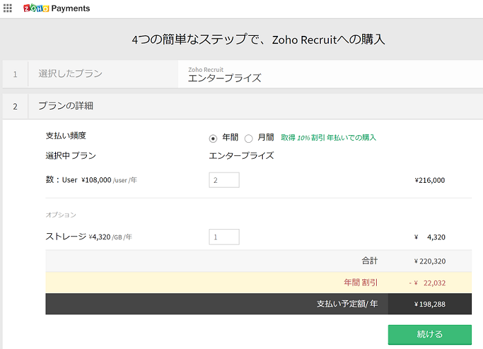 ご希望のプランを選択後、「ストレージオプション」の欄に追加のGB数を入力し、「続ける」をクリックしてください。