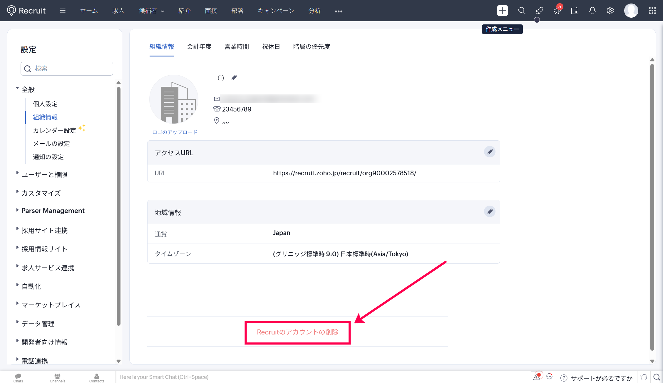 【Zoho Recruit】組織を削除する方法