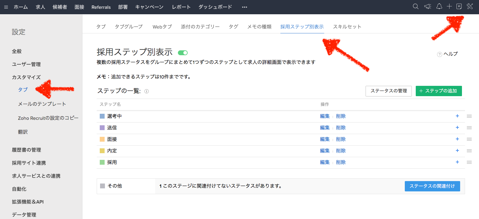 設定 → カスタマイズ→タブ → 採用ステップ別表示 から、