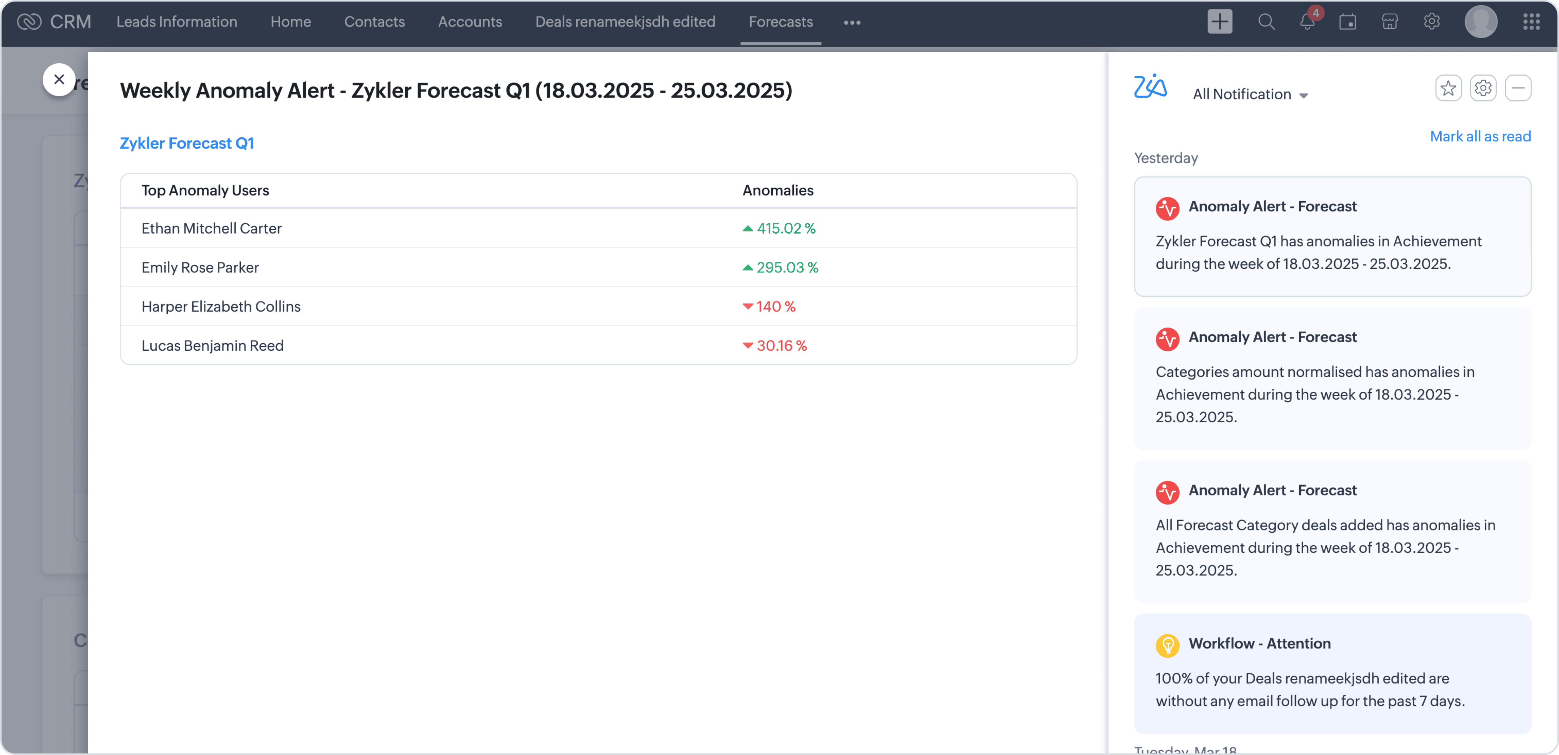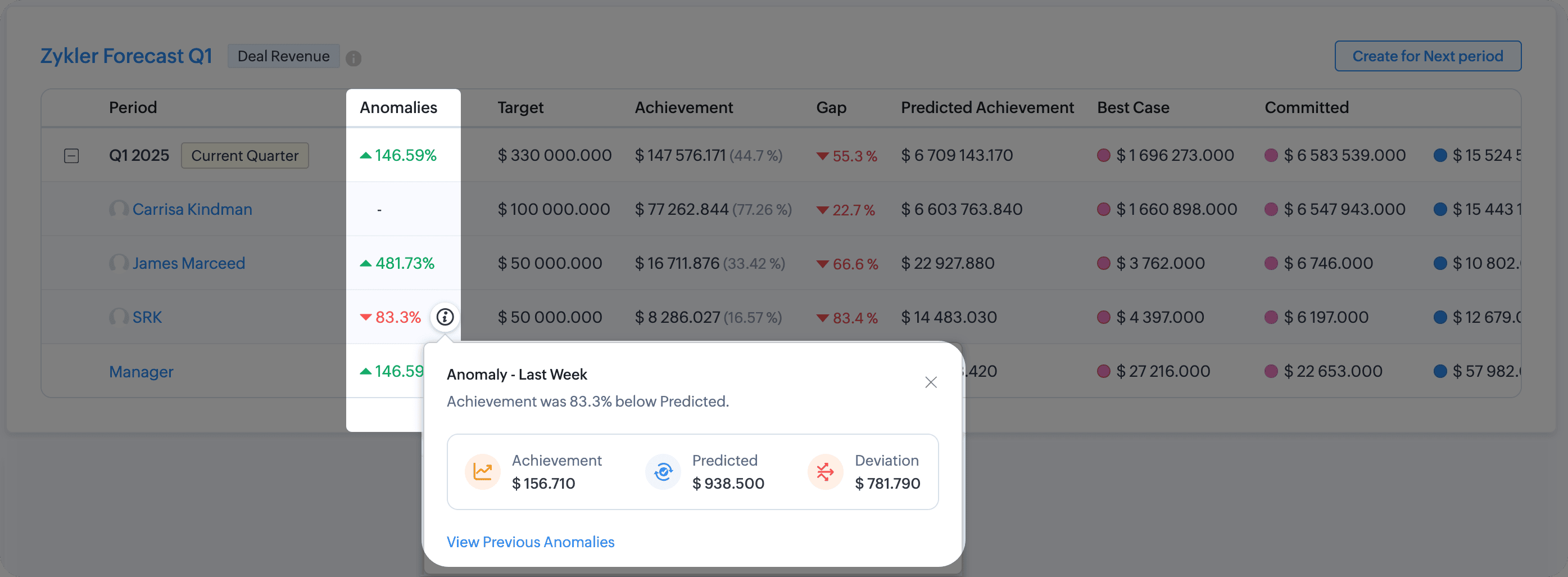 異常値とは、通常のビジネスの流れにおける予期せぬ波や落ち込みのことです。今回の機能アップデートにより、Ziaは売上予測レポートにおいてパフォーマンスに基づく異常値を検出し、予測レポートにおいて毎週ユーザーの実績に見られる異常値を営業リーダーに警告するようになりました。