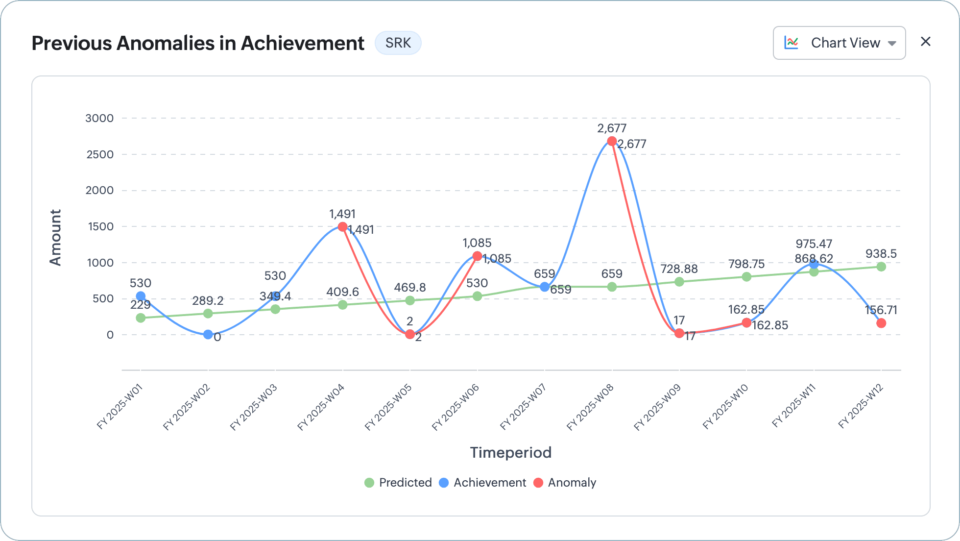 サラは、現在大きな経済的逆風に直面している業界で働いています。その結果、彼女がどんなに頑張っても、数字は低迷している状況です。異常値検知機能のおかげで、彼女のマネージャーはこの低迷をいち早く察知し、彼女の目標や未完了の売上を調整するなどの解決策を思いつくことができます。