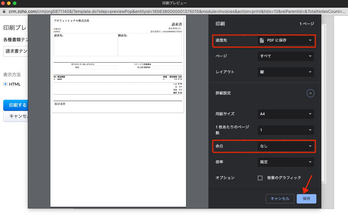 【Zoho CRM】印刷プレビュー(表示方法HTML)からPDFとして保存する