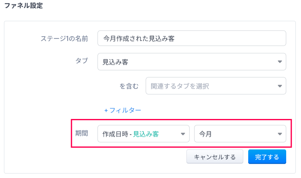 ファネル要素を使用する場合、「今月」作成された見込み客数といったように、データを抽出するための期間を設定する必要があります。