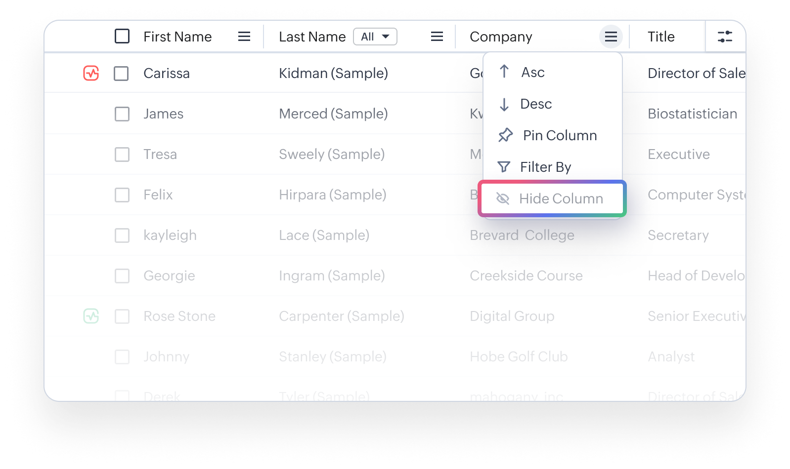 一覧表示の各項目列に新しい「列を隠す」オプションを導入しました。