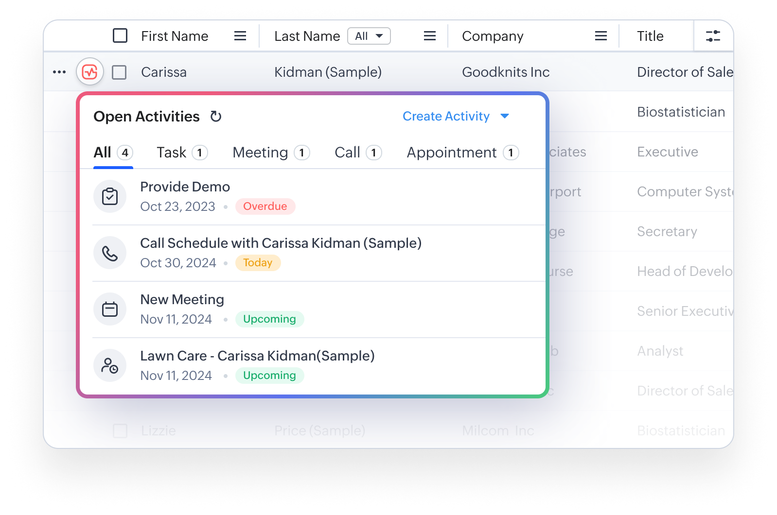 一覧表示内の各データの横にある活動ラベルを変更し、そのデータで未完了の活動(タスク、予定、通話、予約)がある場合に、その未完了の活動が表示されるようになりました。