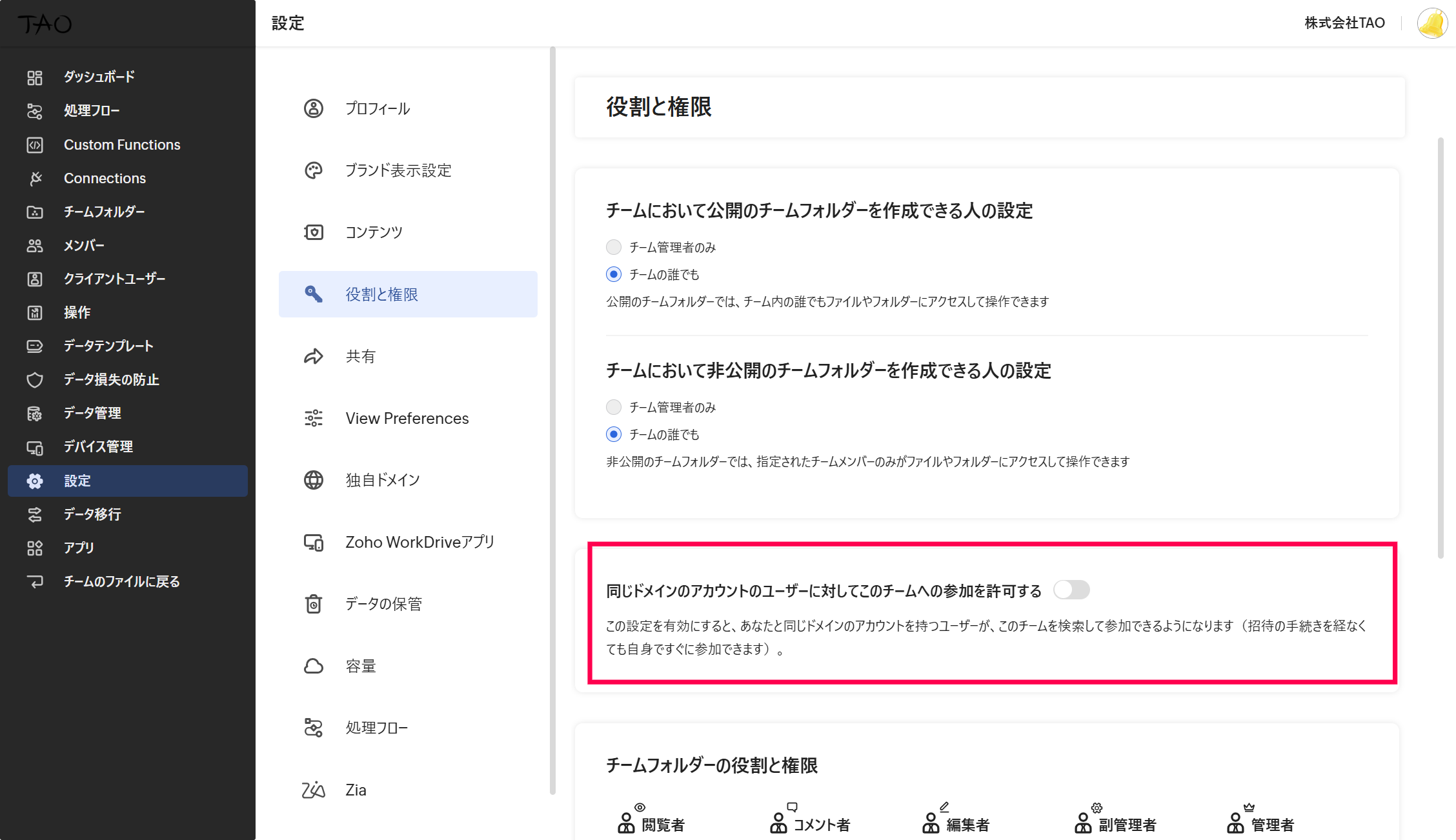 【Zoho Workdrive】(招待ではなく、)同じドメインのアカウントを持つユーザーが自身でチームへ参加できるように設定することは可能ですか?
