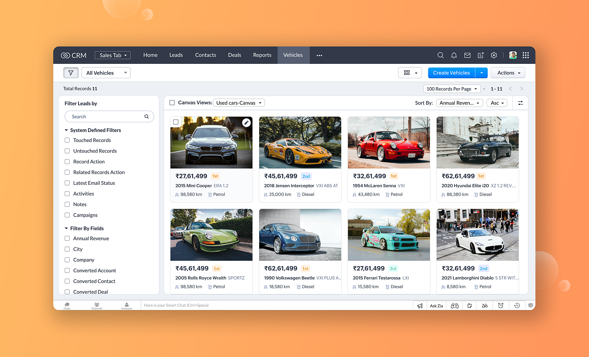 Zoho CRMでは、一覧表示、かんばん表示、キャンバス表示の3つの表示方法で、タブ内のデータを表示することができます。