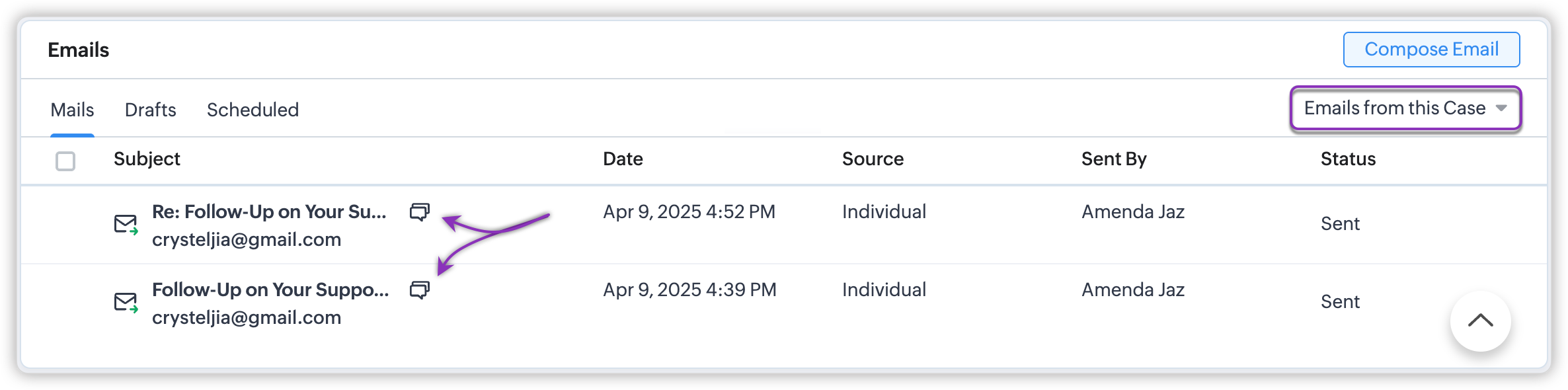 新しい「この問い合わせに関するメール」 (以前は 「問い合わせ」 - 「CRM から送信したメール」 で表示) では、同じスレッドであっても、問い合わせタブから送信されたすべてのメールが関連リストに表示されます。