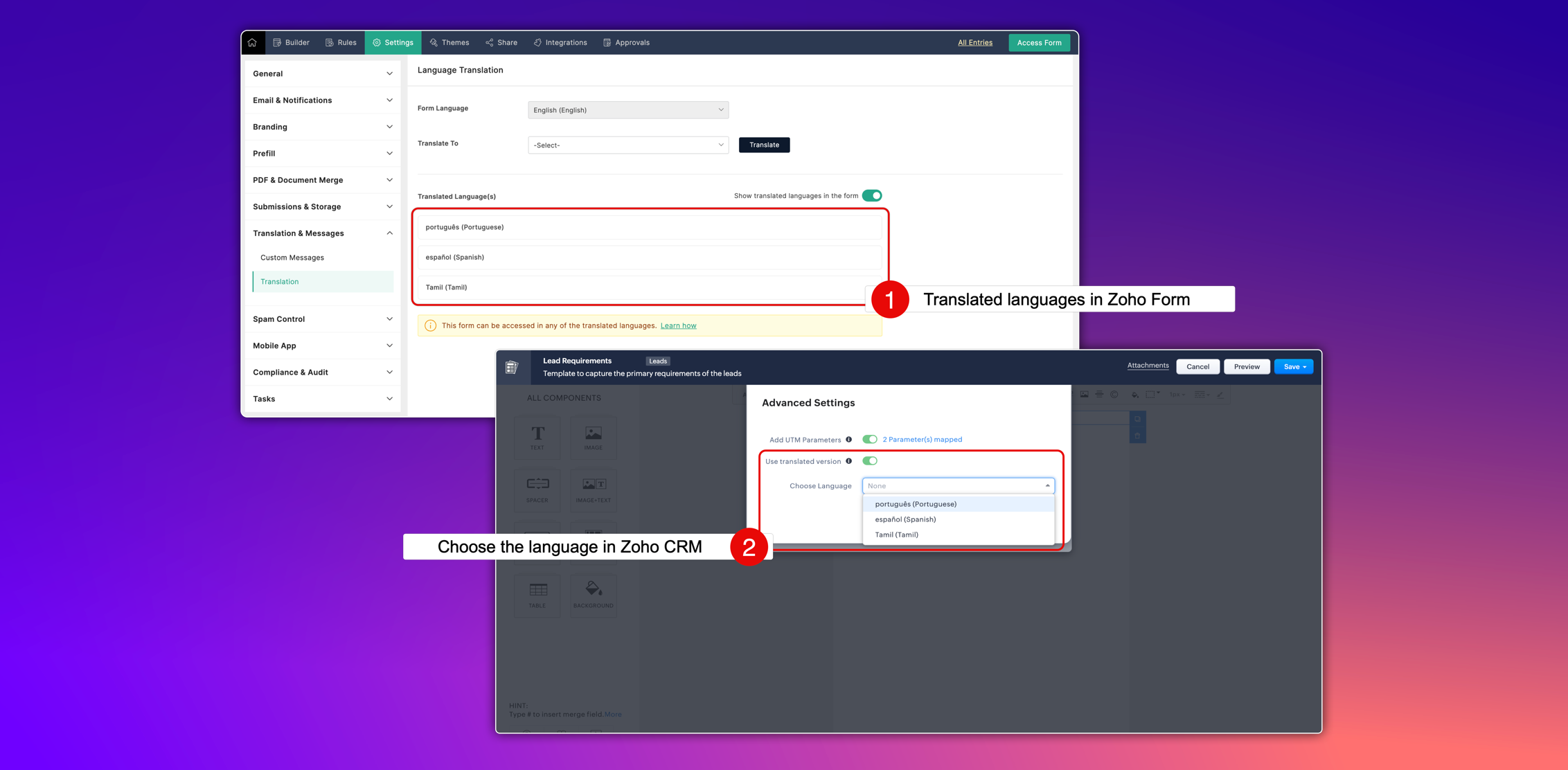 Zoho Forms では、ビジネス領域や地域に合わせてフォームを様々な言語に翻訳することができます。