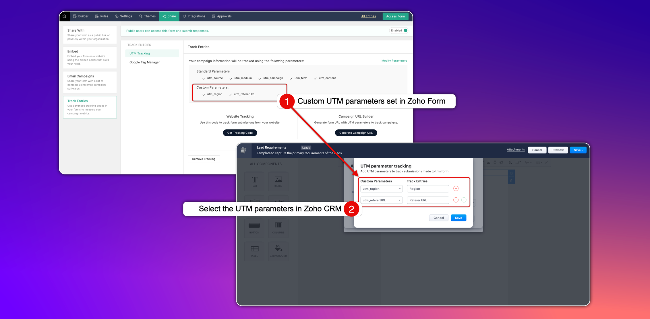 UTMパラメーターを使用すると、どのような取り組みにより見込み客の獲得に繋がったのかが明らかになり、販売促進の効果を追跡できるため、ROI を向上させるために取り組みを最適化することができます。Zoho Forms でUTMの追跡オプションを有効化し、ビジネス要件に基づいたカスタムパラメーターを設定できます。