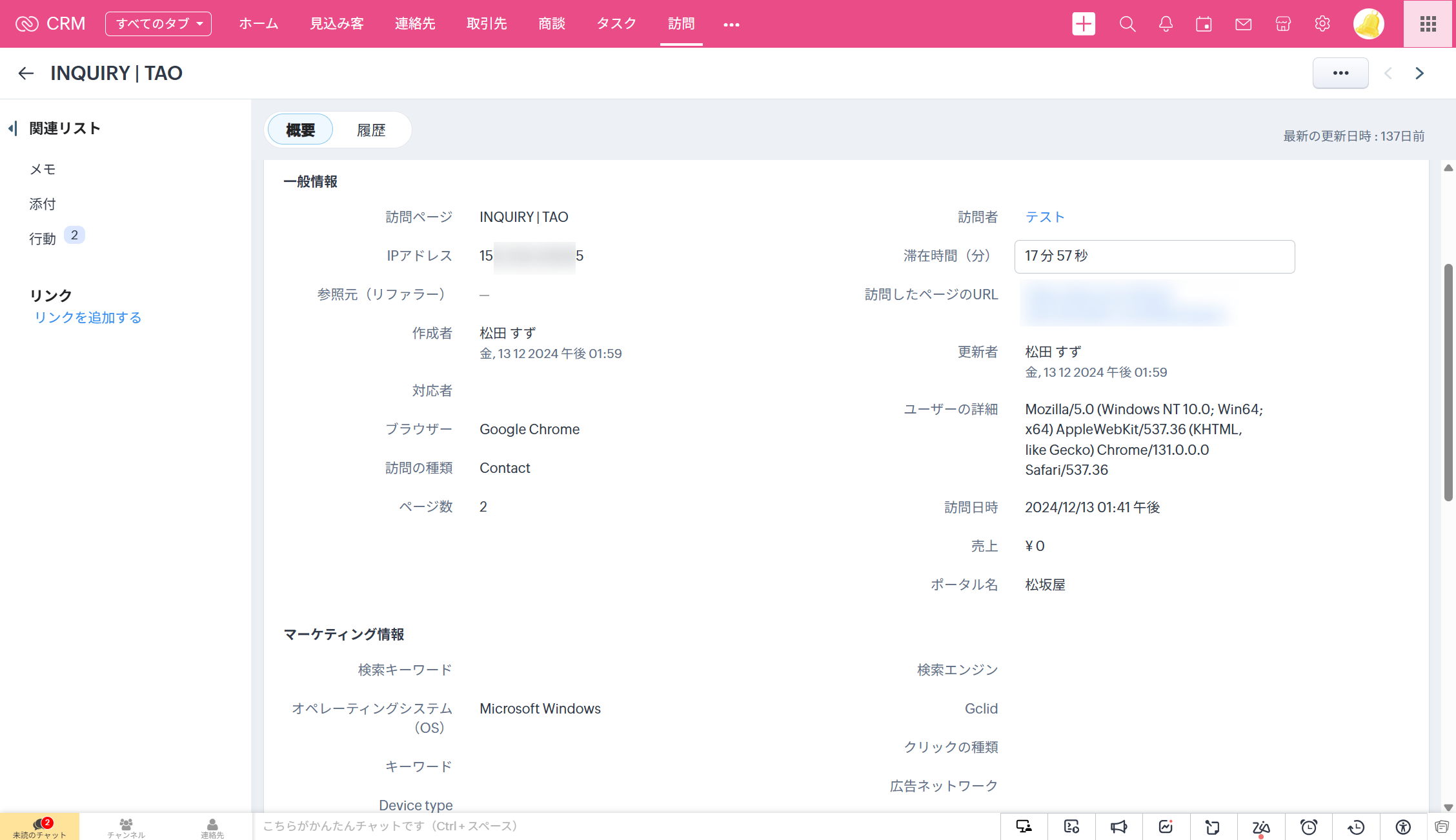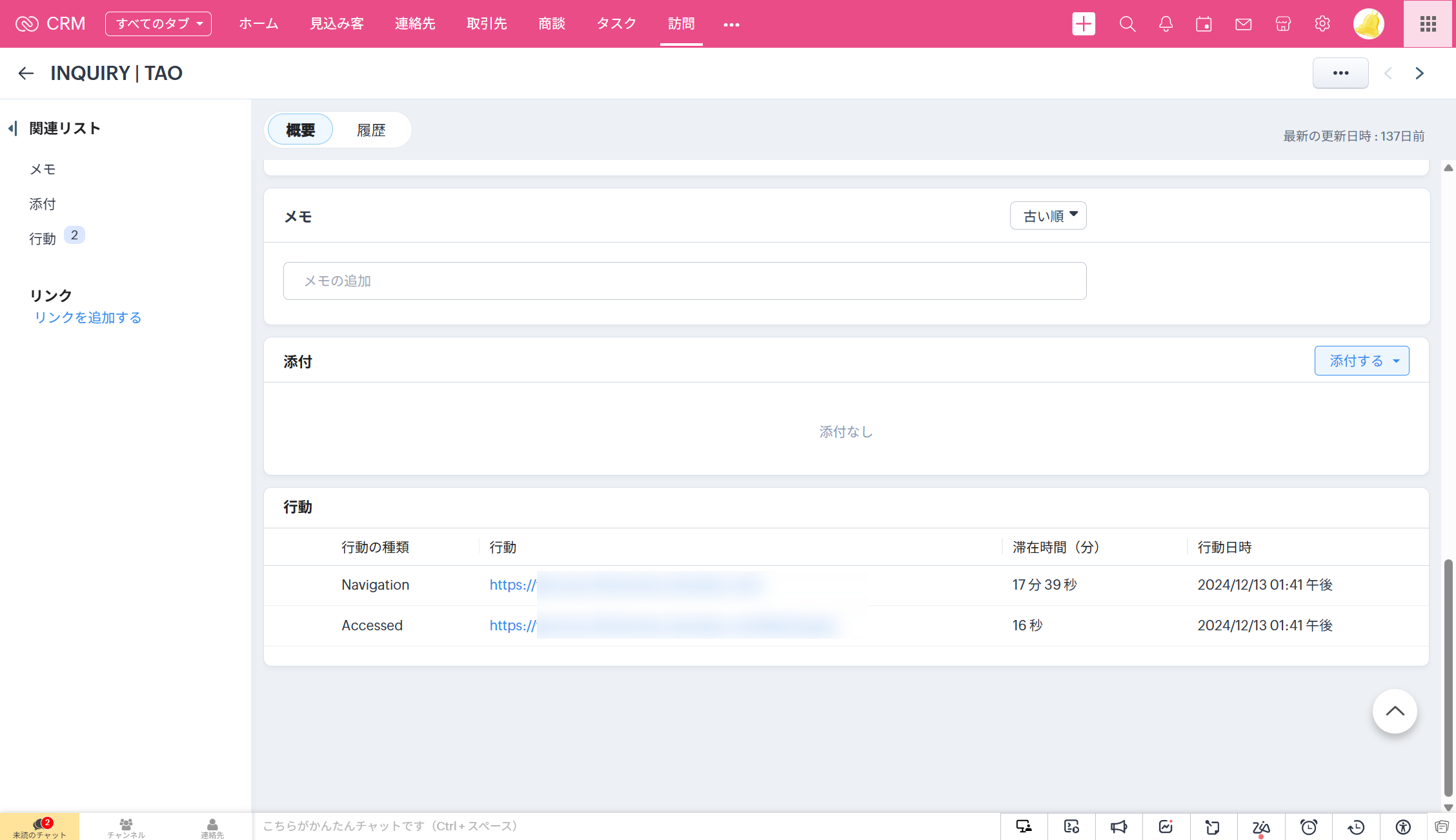 追跡の結果や、チャットの履歴をZoho CRMの訪問タブに表示することができます。