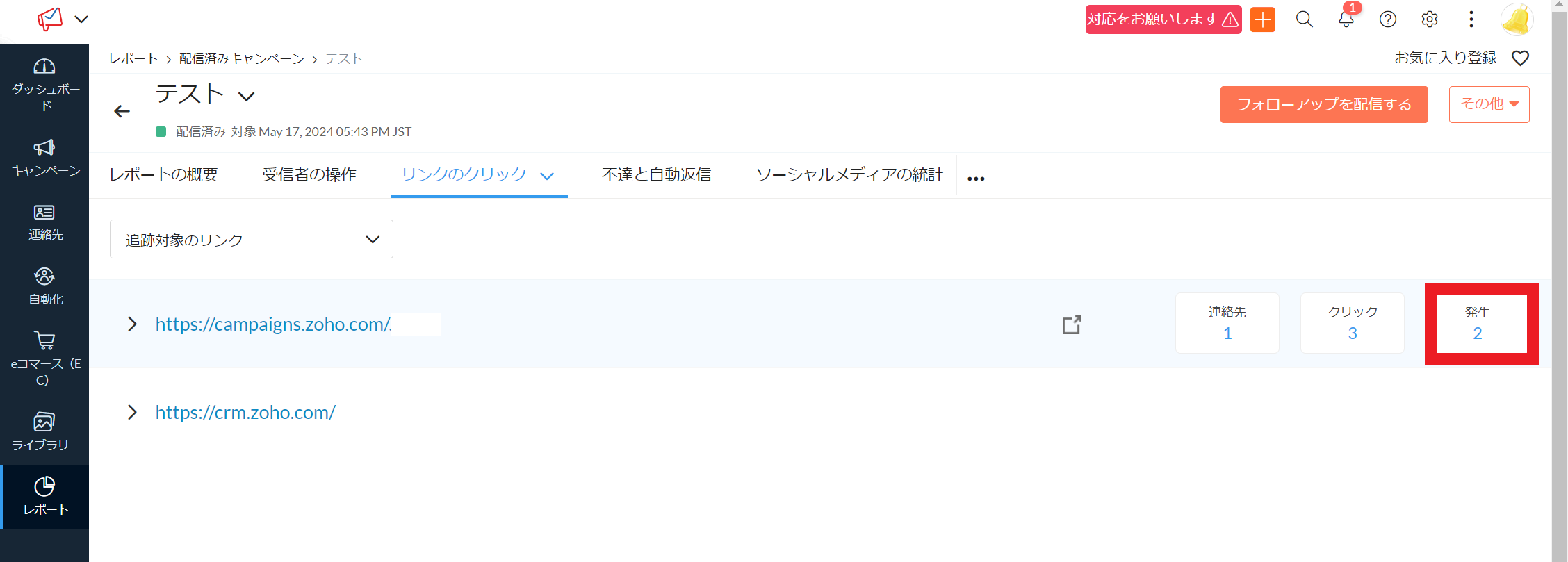 【Zoho Campaigns】レポート:「リンクのクリック」ページ内の「発生」とは?