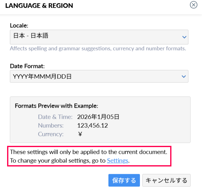 この言語設定が自動になっていると、統合もしくはダウンロードしたPDFで正しく通貨が表示されません。