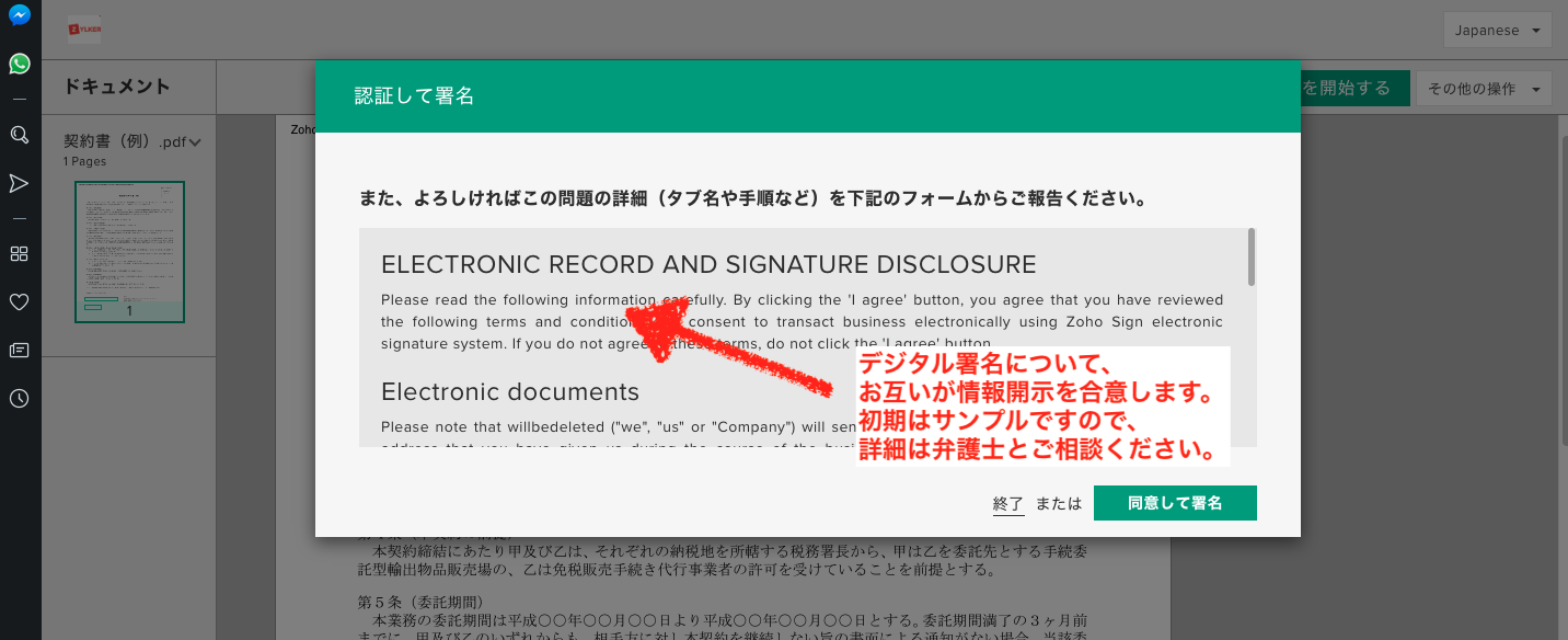 この時点で、情報開示契約が表示されます。これは送信側で編集が可能です。