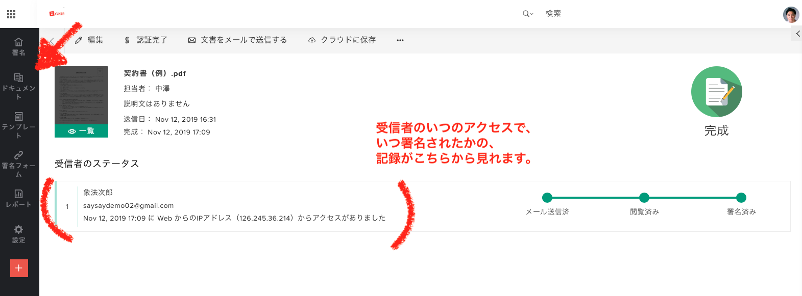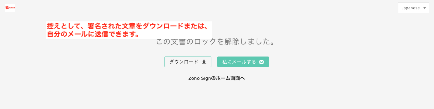控えとして、署名された文章をダウンロードまたは、自分のメールに送信できます。