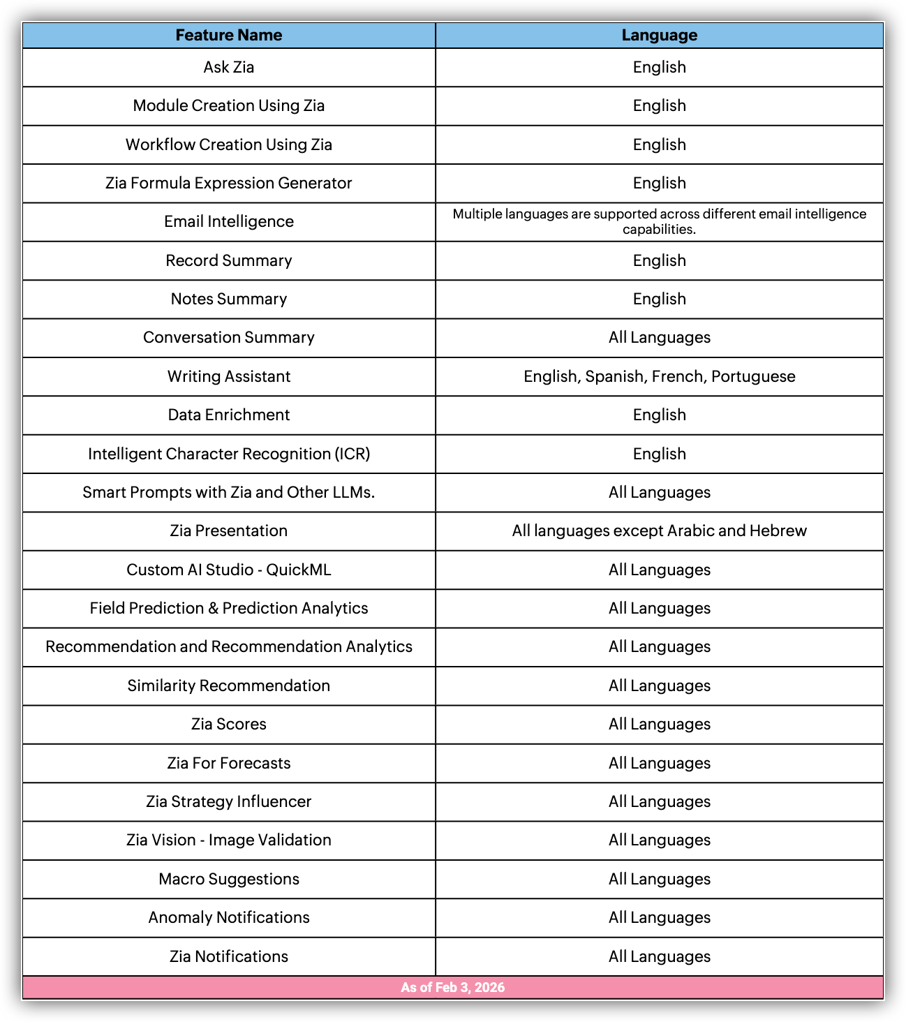 以下は、プロフェッショナルプランで対応しているZia機能の一覧です。