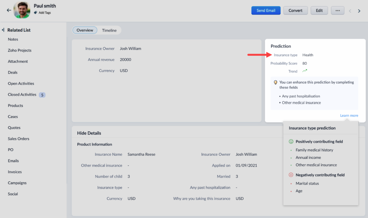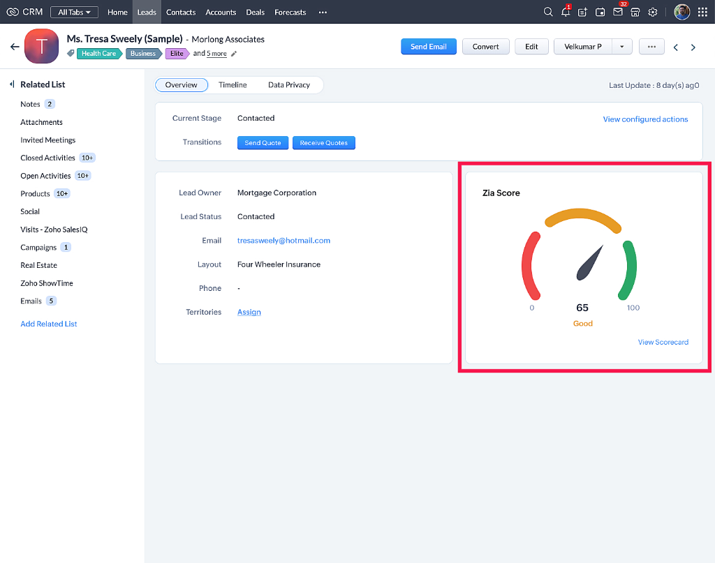 Zoho CRMでは、ZohoのAIアシスタント「Zia」(ジア)によるさまざまな機能を利用することができます。