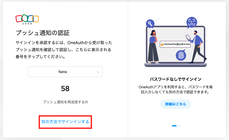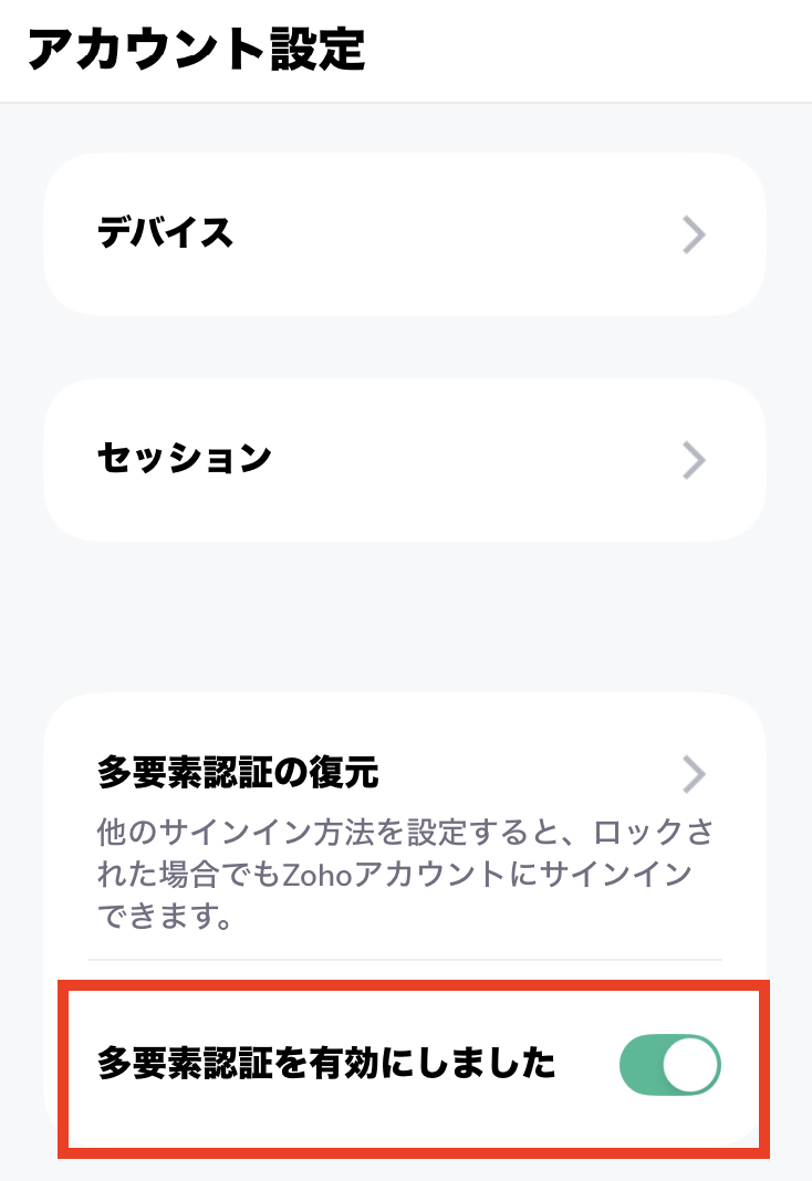 バックアップコードを利用してログインした後、Zoho AccountsもしくはOneAuthアプリより多要素認証を無効化できます。