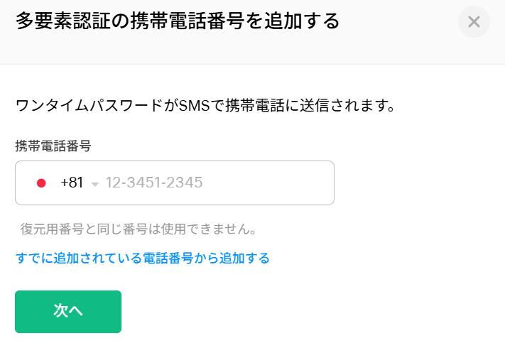 すでにZohoアカウントに携帯電話番号を登録している場合には、「すでに追加されている電話番号から追加する」リンクをクリックすることで、登録済みの携帯電話番号を設定できます。