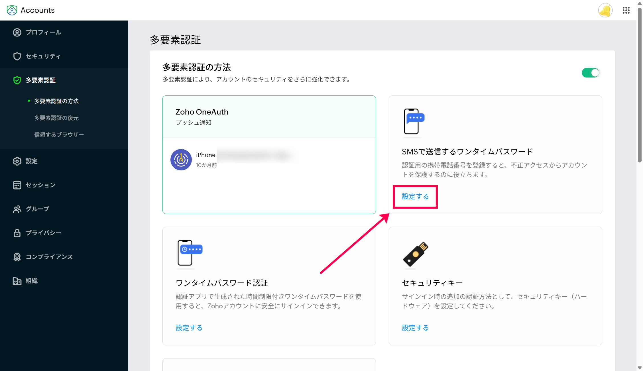 2)「多要素認証」セクション>「SMSで送信するワンタイムパスワード」にある「設定する」リンクをクリックします。